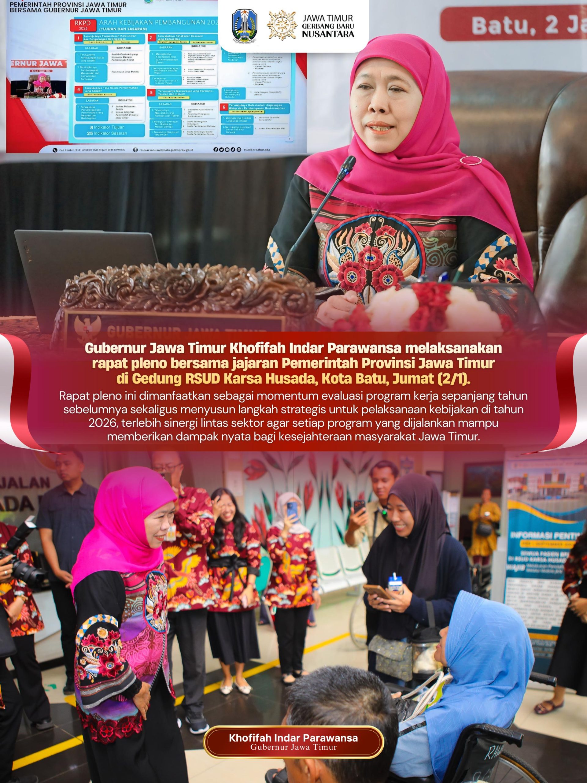 Lentera Post – BATU, 3 JANUARI 2026, Gubernur Jawa Timur Khofifah Indar Parawansa memimpin Rapat Pleno Pemerintah Provinsi Jawa Timur lewat zoom meeting di RSUD Karsa Husada Batu, Jumat (2/1).
