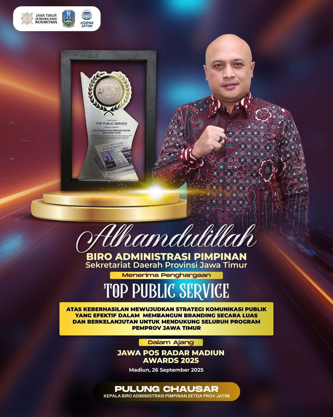 Lentera Post – SURABAYA, 26 SEPTEMBER 2025, Biro Administrasi Pimpinan (Adpim) Sekretariat Daerah Provinsi Jawa Timur kembali menorehkan prestasi membanggakan. Kali ini, Biro Adpim Jatim berhasil meraih penghargaan Top Public Service dalam ajang Jawa Pos Radar Madiun Awards 2025 yang digelar di Aston Madiun Hotel & Conference Center, Jumat (26/9).