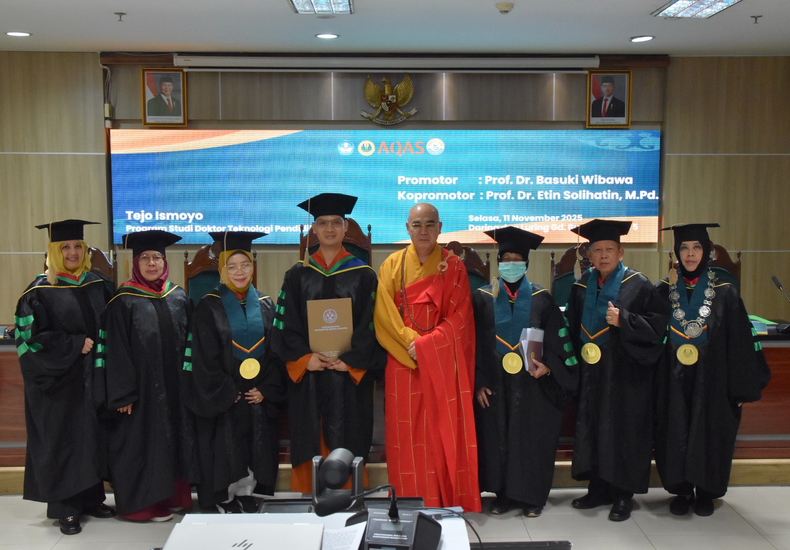 Lentera Post – Jakarta, Di sebuah ruang sidang yang dipenuhi keteduhan akademik, seorang bhiksu berjubah oranye berdiri dengan senyum tenang. Namanya Bhiksu Bhadratamsaka—atau dalam dunia akademik dikenal sebagai Dr. Tejo Ismoyo, M.Pd., M.Pd.B., C.PS. Pada Selasa, 11 November 2025, ia resmi dikukuhkan sebagai Doktor Teknologi Pendidikan Universitas Negeri Jakarta (UNJ), menorehkan sejarah sebagai biksu pertama dari Kabupaten Pesisir Barat, Lampung, yang mencapai puncak pendidikan tertinggi di bidang tersebut.