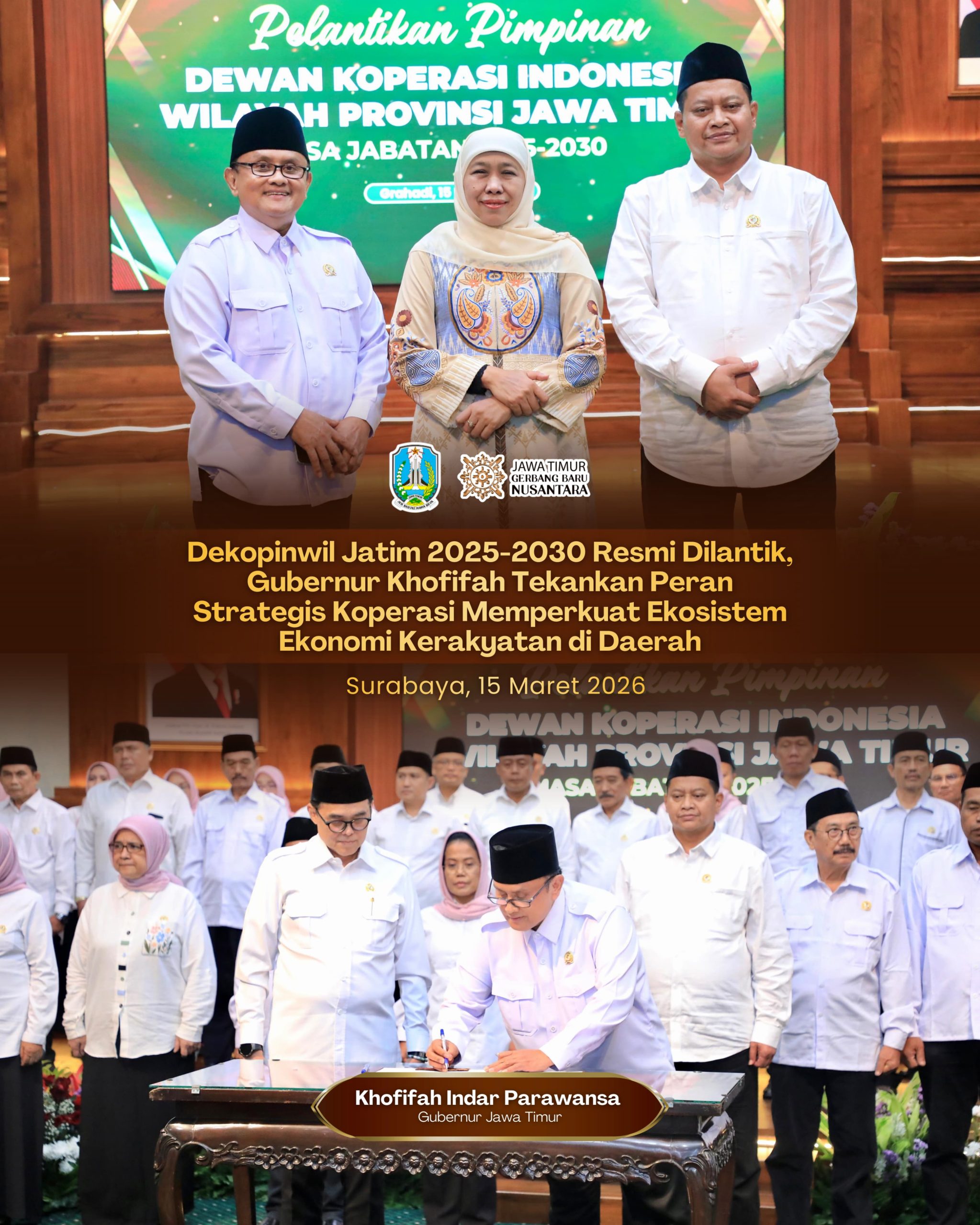 “Hari ini kita resmi melantik pengurus Dekopinwil Jawa Timur dan kita harus bekerja bersama-sama demi kelangsungan gerakan koperasi agar semakin maju dan mampu menjadi alat untuk mensejahterakan anggota serta masyarakat,” pungkasnya.