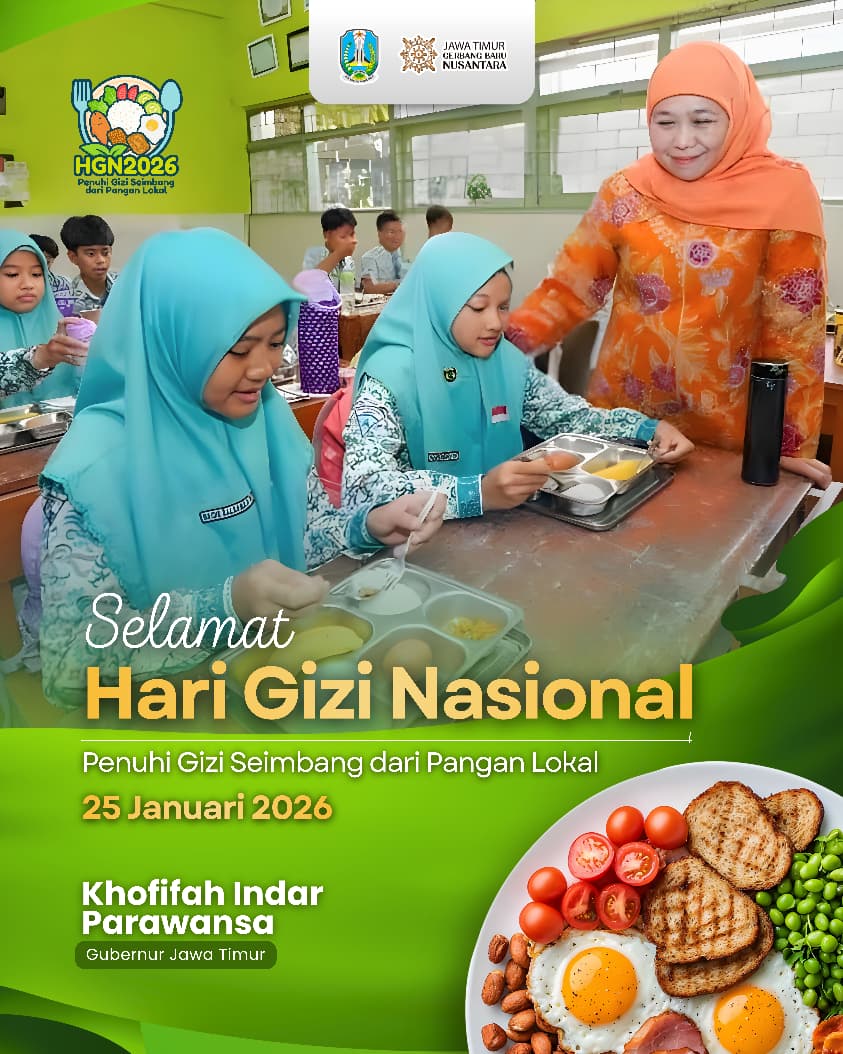 Lentera Post – SURABAYA, 25 JANUARI 2026, Gubernur Jawa Timur Khofifah Indar Parawansa menegaskan komitmen Pemerintah Provinsi Jawa Timur dalam memperkuat pembangunan gizi masyarakat pada peringatan Hari Gizi Nasional (HGN) Tahun 2026.