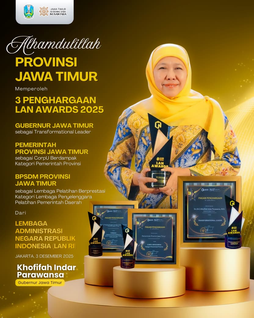 Dalam hal ini, Khofifah merupakan satu-satunya gubernur penerima penghargaan Transformational Leader di ajang LAN Awards 2025 ini. Untuk BPSDM Jatim sendiri telah meraih penghargaan lembaga pendidikan berprestasi terbaik untuk keempat kalinya.
