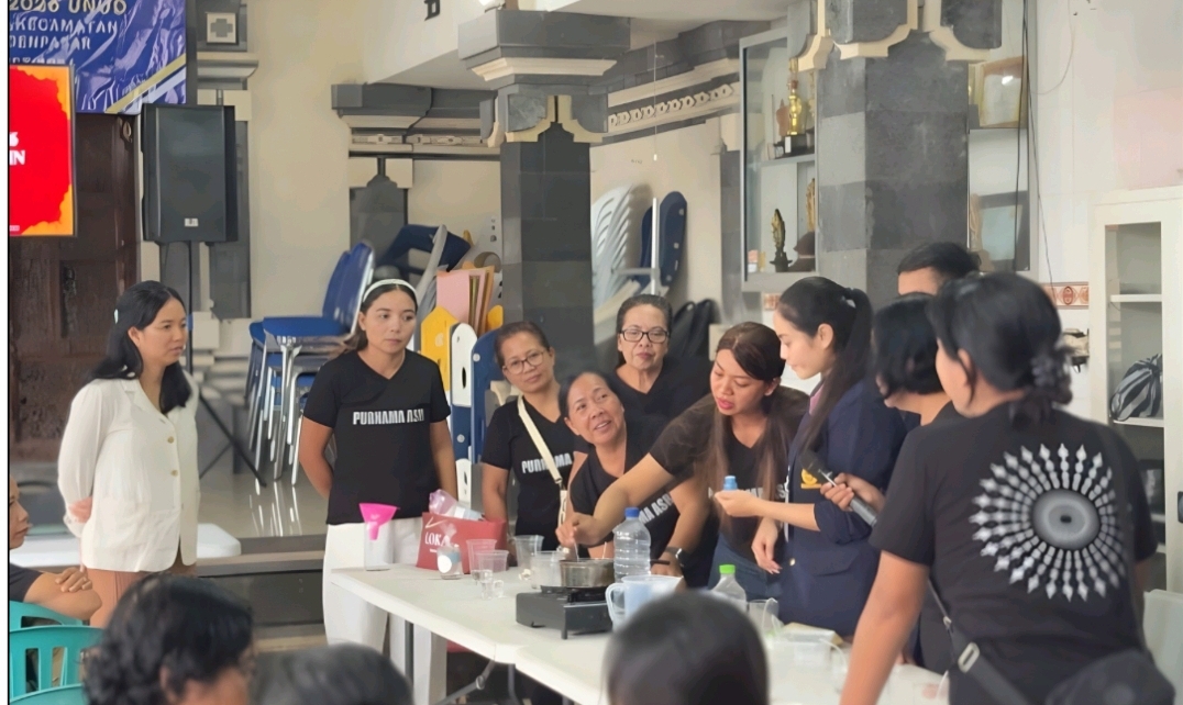 Lentera Post – Denpasar, Mahasiswa Kuliah Kerja Nyata (KKN) Universitas Udayana Periode XXXII Tahun 2026 menggelar sosialisasi bertajuk Stop Boros Pangan dan Pengolahan Limbah Rumah Tangga Minyak Jelantah Menjadi Water Candle di Banjar Purnama Asri, Desa Peguyangan Kangin, Kecamatan Denpasar Utara, pada Minggu (1/3/2026). Kegiatan ini diikuti oleh 85 orang peserta yang merupakan ibu-ibu PKK Banjar Purnama Asri.