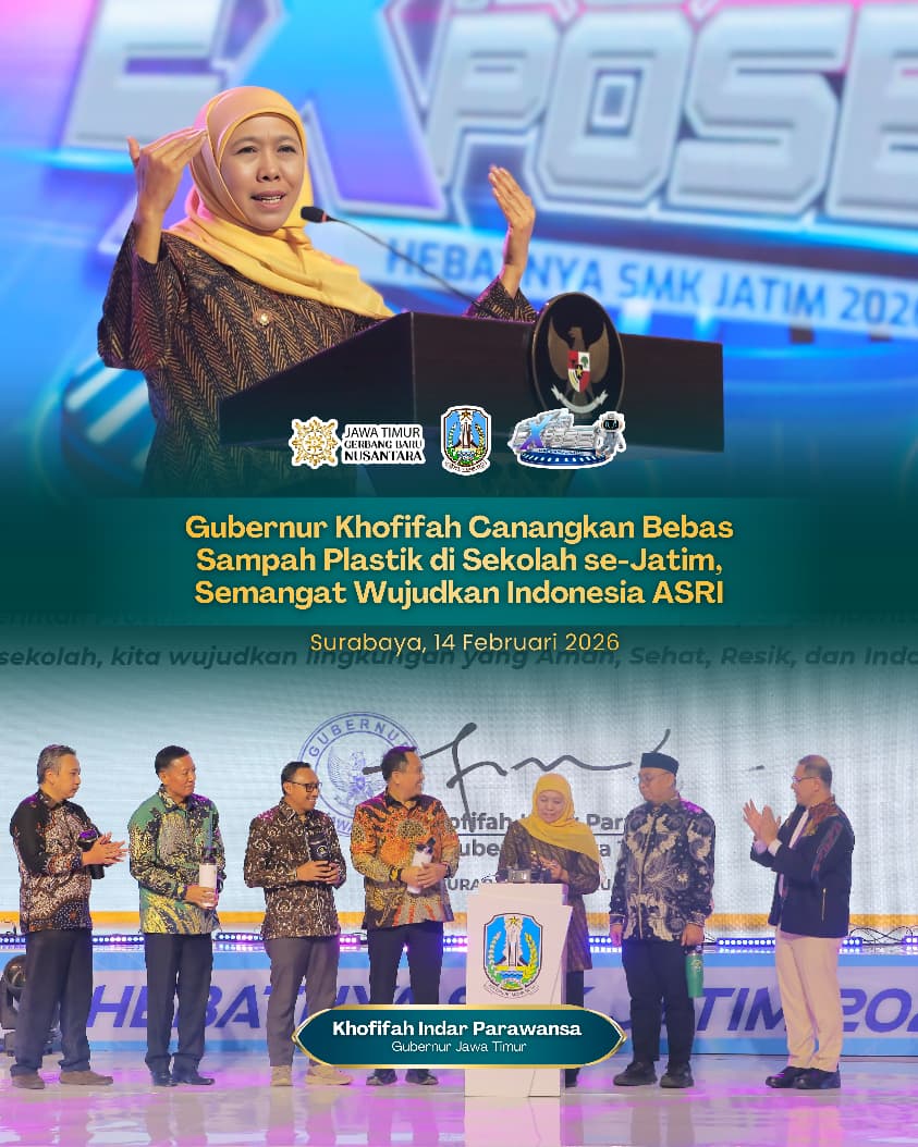 Lentera Post – SURABAYA, 15 FEBRUARI 2026, Gubernur Jawa Timur Khofifah Indar Parawansa melakukan pencanangan gerakan bebas sampah plastik di lingkungan sekolah yang digelar di sela Expo dan Expose Hebatnya SMK Jatim, di Grand City, Sabtu (14/2).