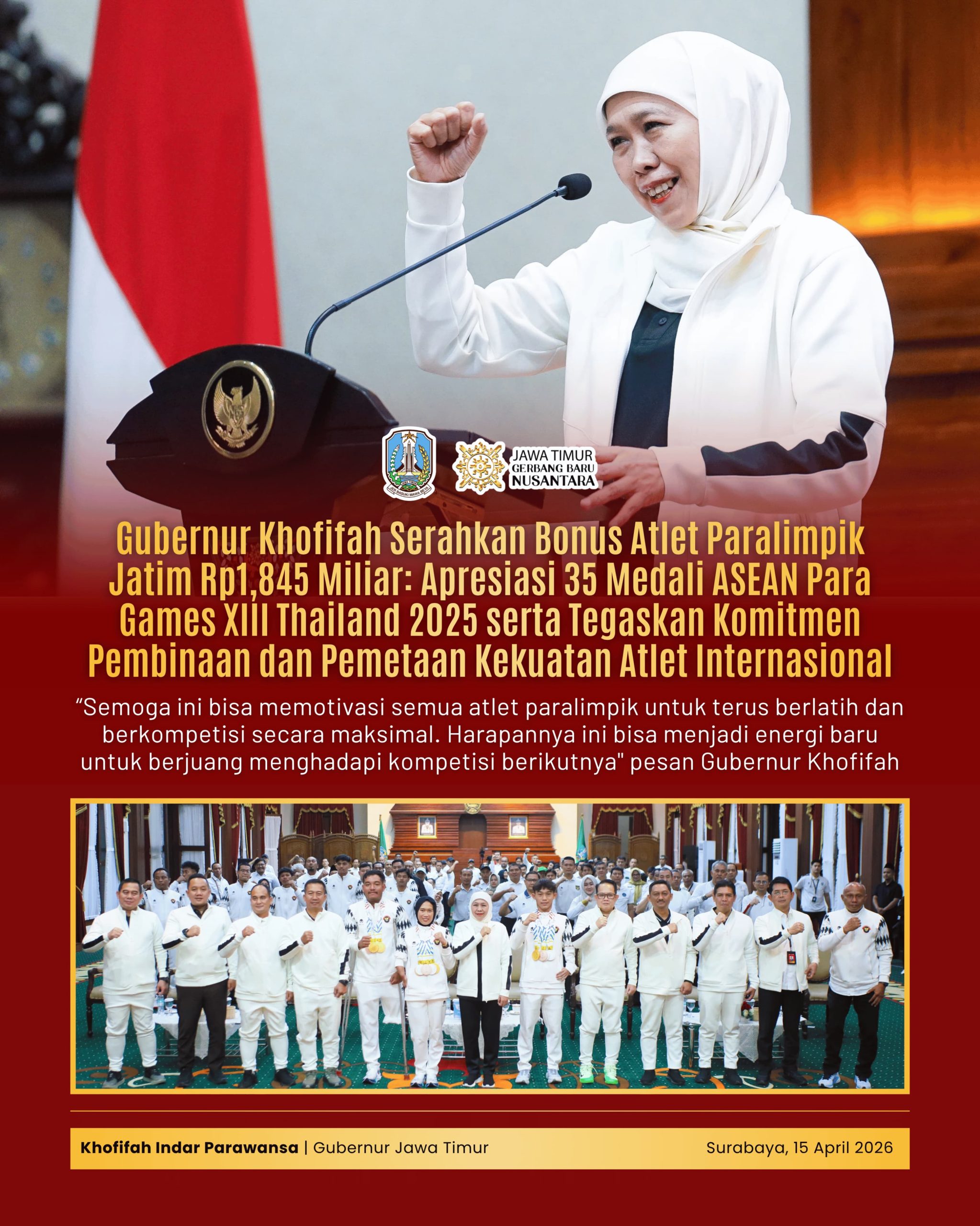 Lentera Post – SURABAYA, 16 APRIL 2026, Gubernur Jawa Timur Khofifah Indar Parawansa memberikan penghargaan berupa bonus apresiasi senilai total Rp1,845 miliar kepada 15 atlet paralimpik dan dua pelatih Jawa Timur yang berprestasi pada ajang ASEAN Para Games 2025 di Thailand.