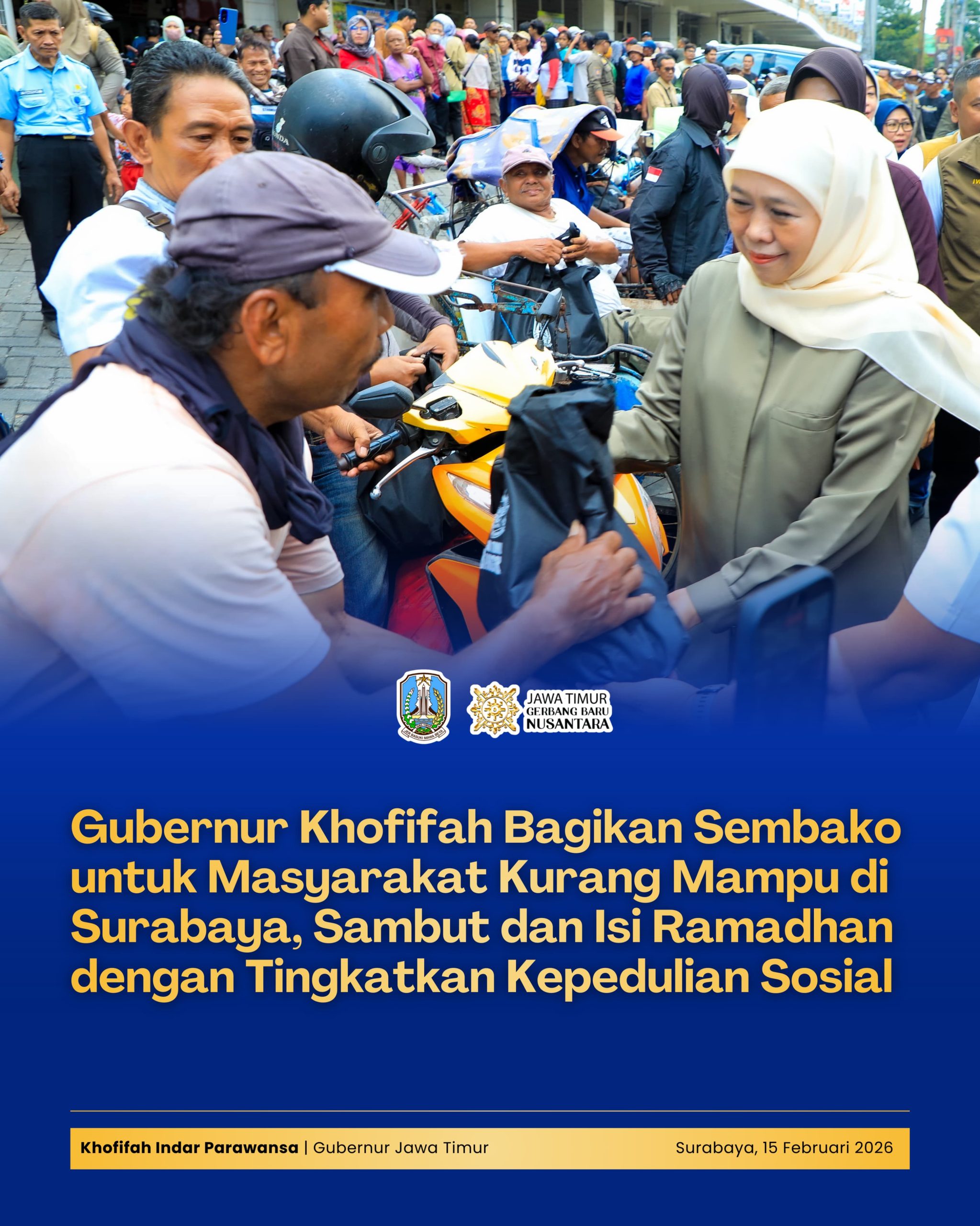 Lentera Post – SURABAYA, 16 FEBRUARI 2026, Menyambut datangnya Bulan Suci Ramadhan 1447 Hijriah, Gubernur Jawa Timur Khofifah Indar Parawansa membagikan ratusan paket sembako kepada masyarakat kurang mampu, marbot dan petugas kebersihan masjid, serta pengemudi ojek online (ojol) di Kota Surabaya, Minggu (15/2).