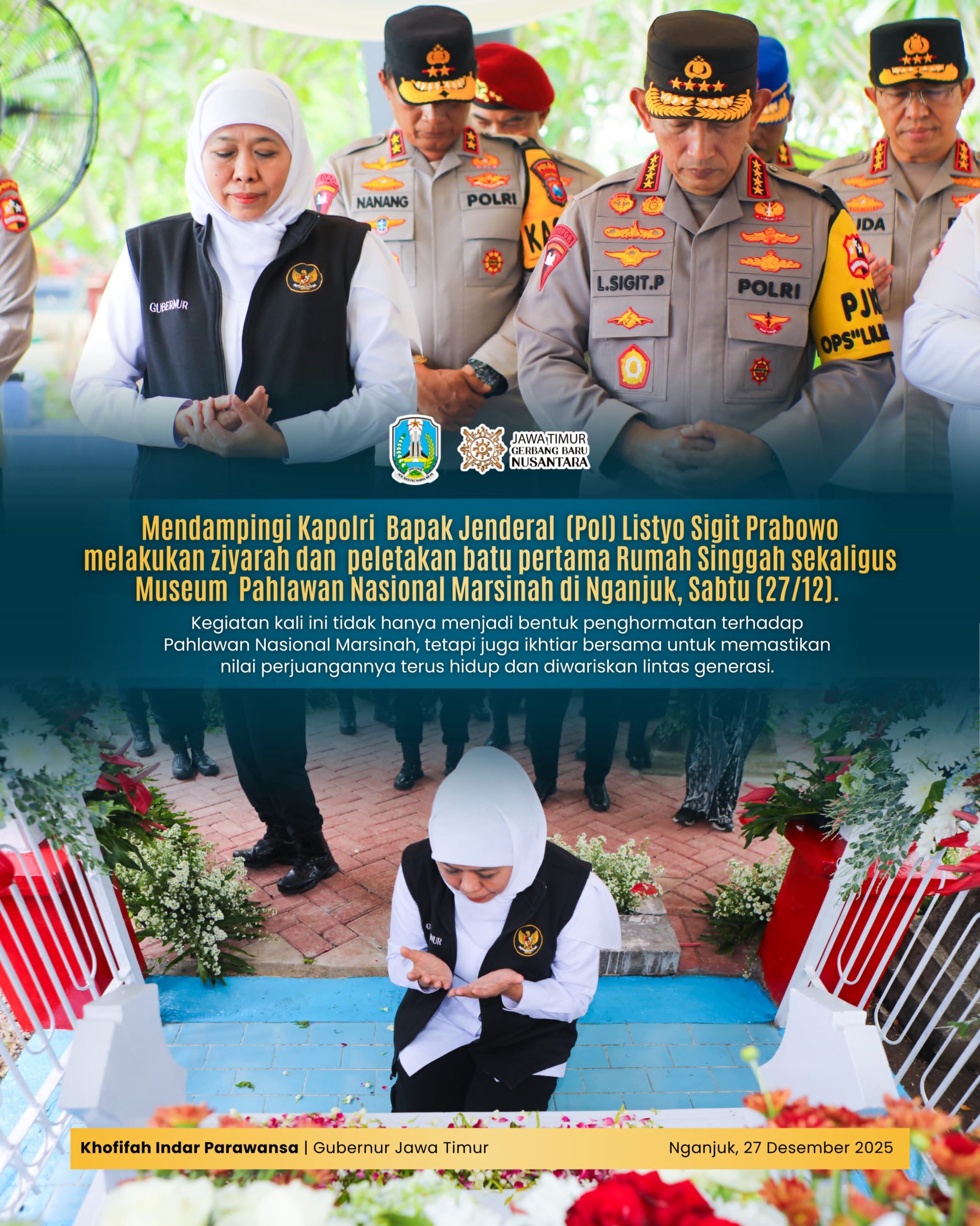 Lentera Post – NGANJUK, 28 DESEMBER 2025, Gubernur Jawa Timur Khofifah Indar Parawansa mendampingi Kapolri Bapak Jenderal Listyo Sigit Prabowo melakukan ziyarah dan peletakan batu pertama Rumah Singgah sekaligus Museum Pahlawan Nasional Marsinah di Nganjuk, Sabtu (27/12).