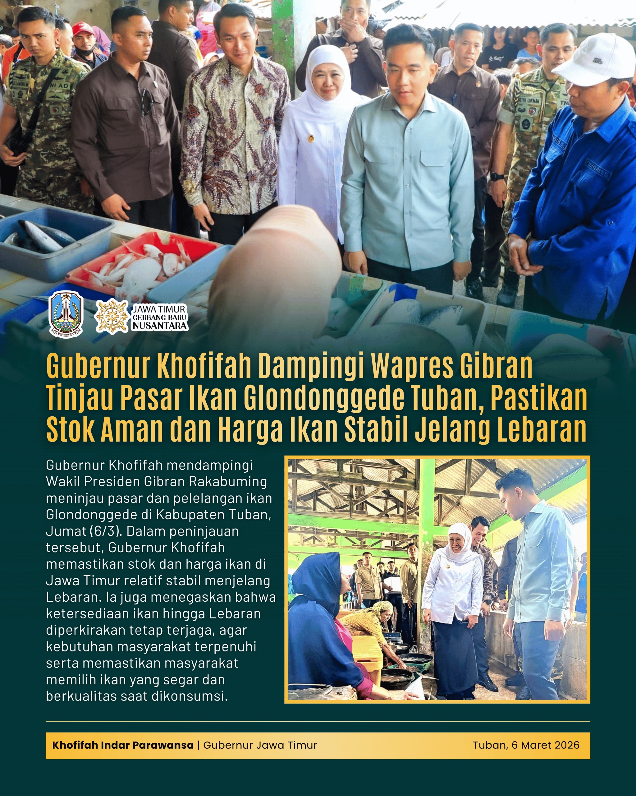 Lentera Post – TUBAN, 6 MARET 2026, Gubernur Jawa Timur Khofifah Indar Parawansa mendampingi Wakil Presiden RI Gibran Rakabuming meninjau Pasar Gelondong Gede, Kabupaten Tuban, Jumat (6/3). Setibanya di lokasi, Wapres Gibran beserta rombongan disambut oleh Kepala Pasar Gelondong Gede Sutadji serta Kepala UPTD Pengelolaan TPI Agus Saleh Setiawan.