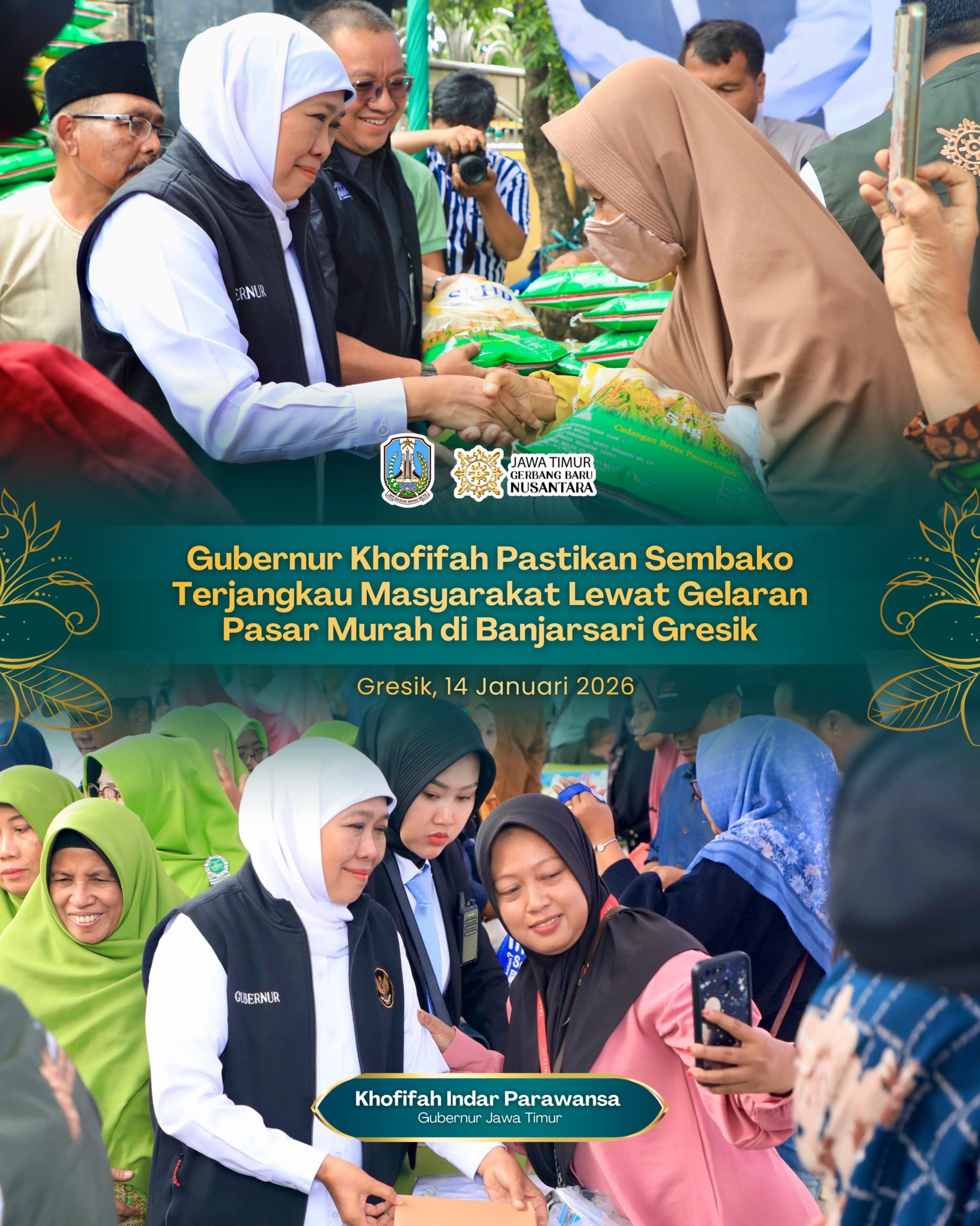 Lentera Post – GRESIK, 15 JANUARI 2026, Gubernur Jawa Timur Khofifah Indar Parawansa menggelar Pasar Murah di Balai Desa Banjarsari, Kecamatan Cerme, Kabupaten Gresik, Rabu (14/1).