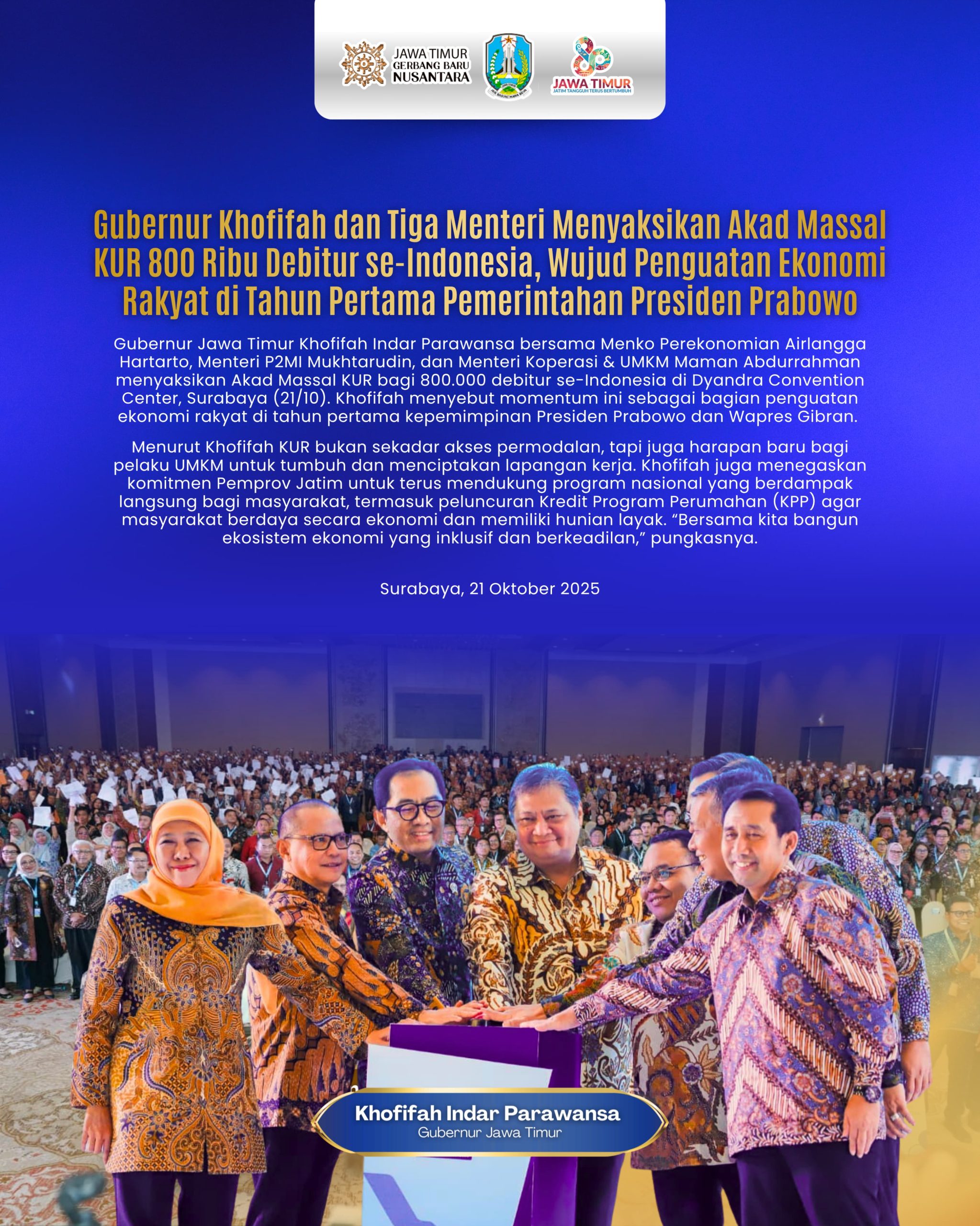 Lebih lanjut, Khofifah menyebut acara ini menjadi bermakna karena momen pelaksanaan Akad Massal KUR ini khususnya di momen Hari Jadi ke 80 Prov. Jatim pada 12 Oktober lalu. Dengan semangat ‘Jatim Tangguh Terus Bertumbuh’, ia menegaskan komitmen Pemprov Jatim untuk terus mendukung program-program pemerintah pusat yang berdampak langsung bagi masyarakat.
