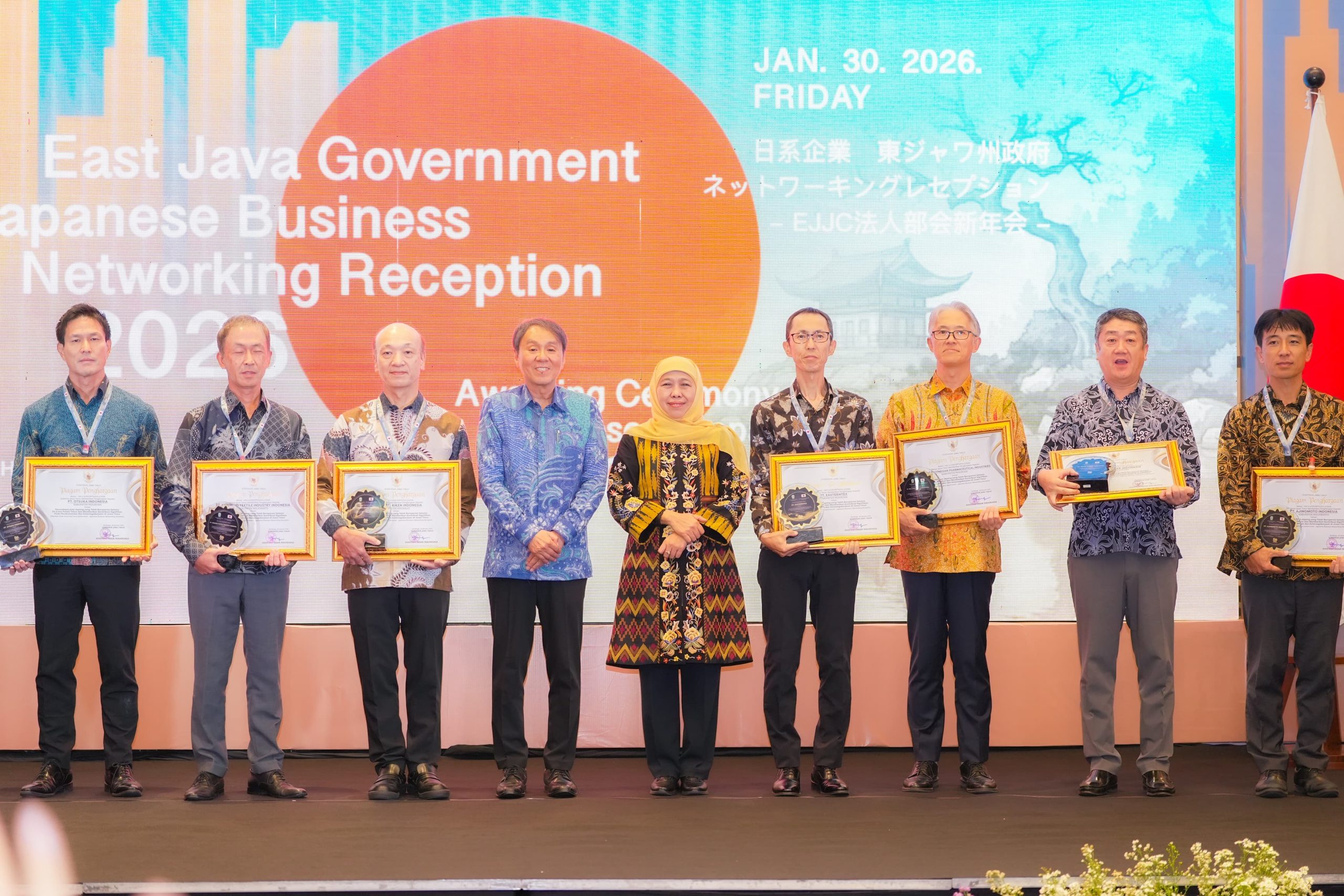 Pada akhir acara, Gubernur Khofifah didampingi Konsul Jenderal Jepang Takonai Susumu menyerahkan penghargaan kepada delapan perusahaan Jepang yang telah beroperasi selama lebih dari 50 tahun di Jawa Timur.