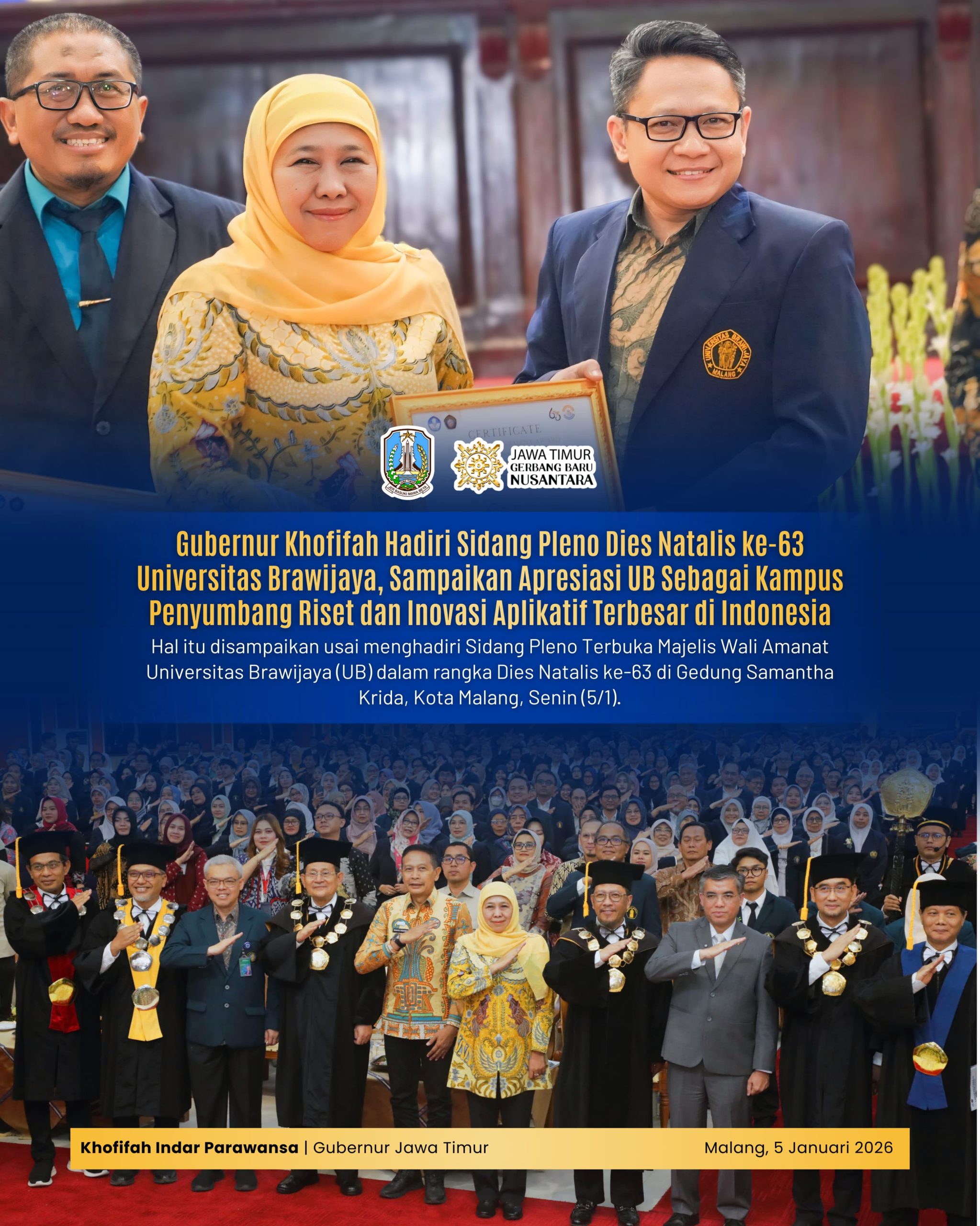 Gubernur Khofifah menyampaikan apresiasi kepada Universitas Brawijaya yang telah melakukan peran strategis sebagai perguruan tinggi dalam membangun sumber daya manusia unggul dan menghadirkan solusi konkret untuk menjawab tantangan zaman.