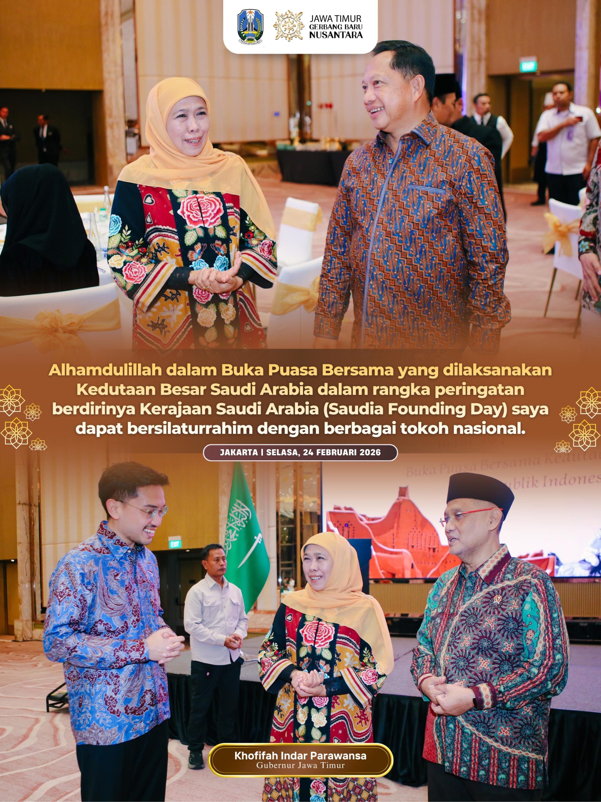 Lentera Post – JAKARTA, 24 FEBRUARI 2026, Gubernur Jawa Timur Khofifah Indar Parawansa menghadiri undangan buka puasa bersama yang diselenggarakan Kedutaan Besar Kerajaan Saudi Arabia untuk Republik Indonesia, ASEAN, dan Timor Leste di Hotel St. Regis Jakarta, Selasa (24/2).