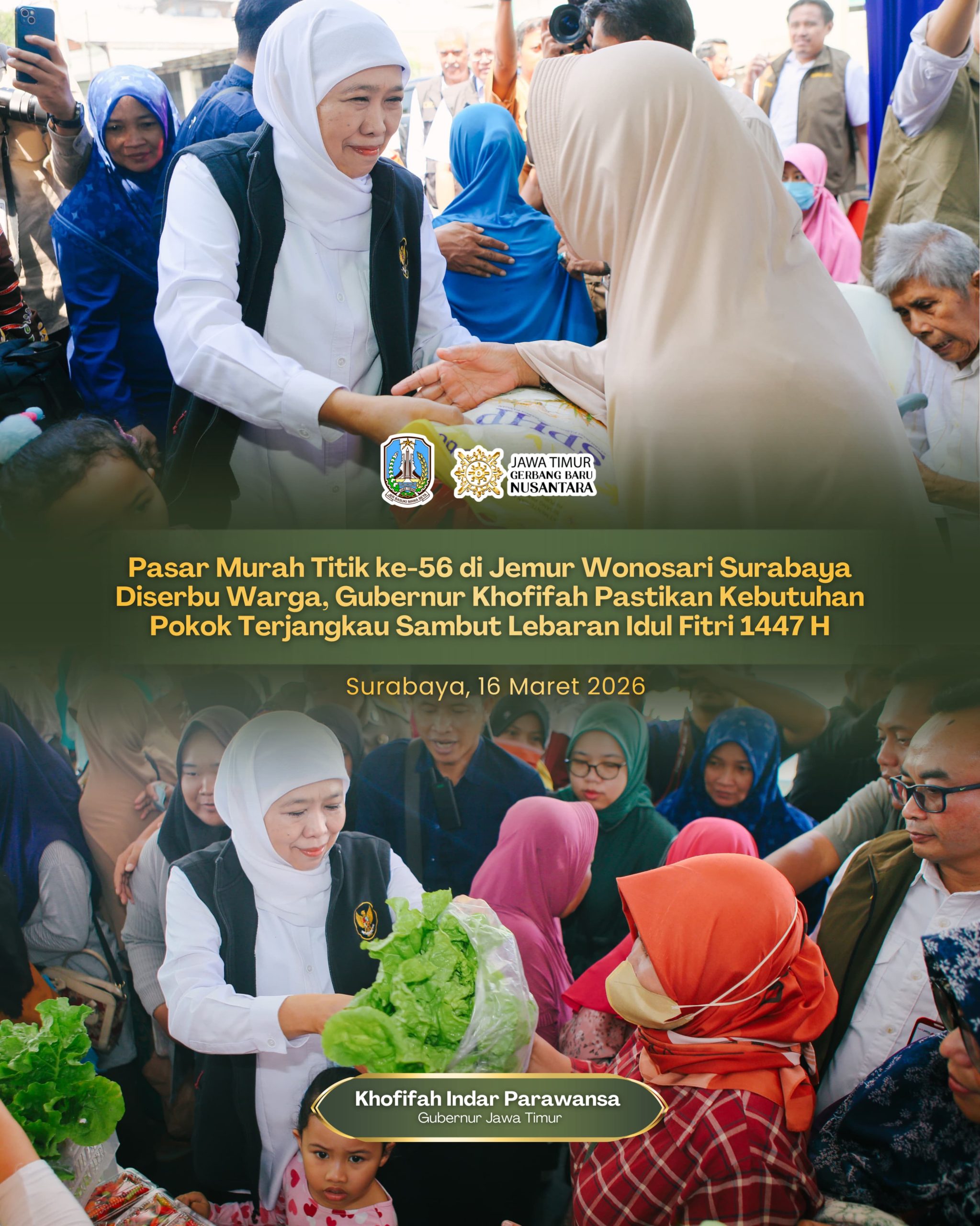 Lentera Post – SURABAYA, 16 MARET 2026, Menjelang Idul Fitri 1447 Hijriah, Gubernur Jawa Timur Khofifah Indar Parawansa menggencarkan pelaksanaan Pasar Murah guna membantu masyarakat memperoleh bahan kebutuhan pokok dengan harga terjangkau sekaligus menjaga stabilitas harga di pasaran.