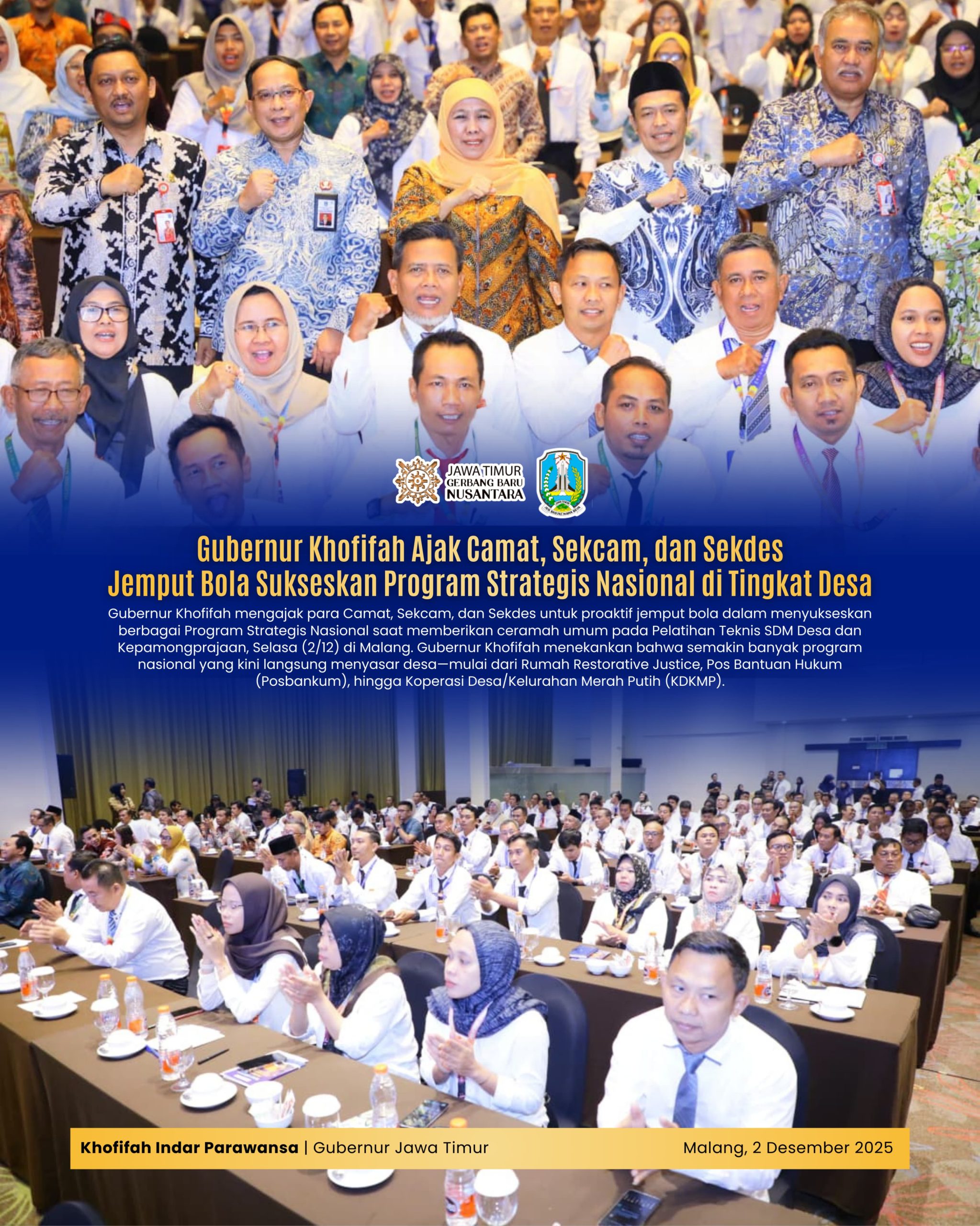 Lentera Post – MALANG, 3 DESEMBER 2025, Gubernur Jawa Timur Khofifah Indar Parawansa mengajak para camat, sekretaris camat (Sekcam) dan Sekretaris Desa (Sekdes) untuk proaktif melakukan jemput bola untuk menyukseskan berbagai program strategis nasional.