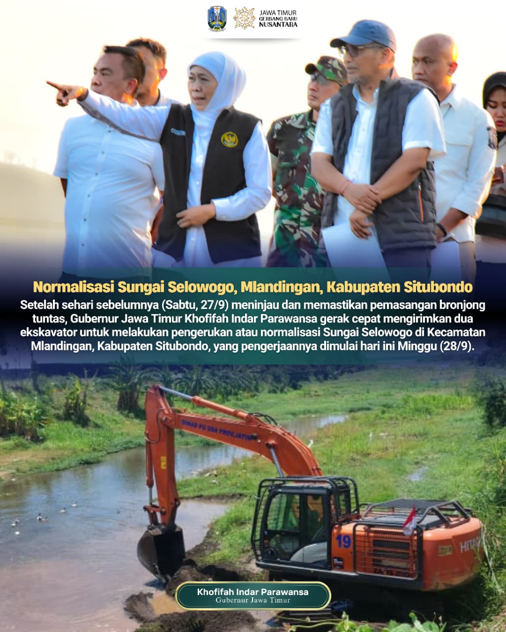 Lentera Post – PALEMBANG, 28 SEPTEMBER 2025, Setelah sehari sebelumnya meninjau dan memastikan pemasangan bronjong tuntas, Gubernur Jawa Timur Khofifah Indar Parawansa gerak cepat mengirimkan dua ekskavator untuk melakukan pengerukan atau normalisasi Sungai Selowogo di Kecamatan Mlandingan, Kabupaten Situbondo, yang pengerjaannya dimulai hari ini Minggu (28/9).