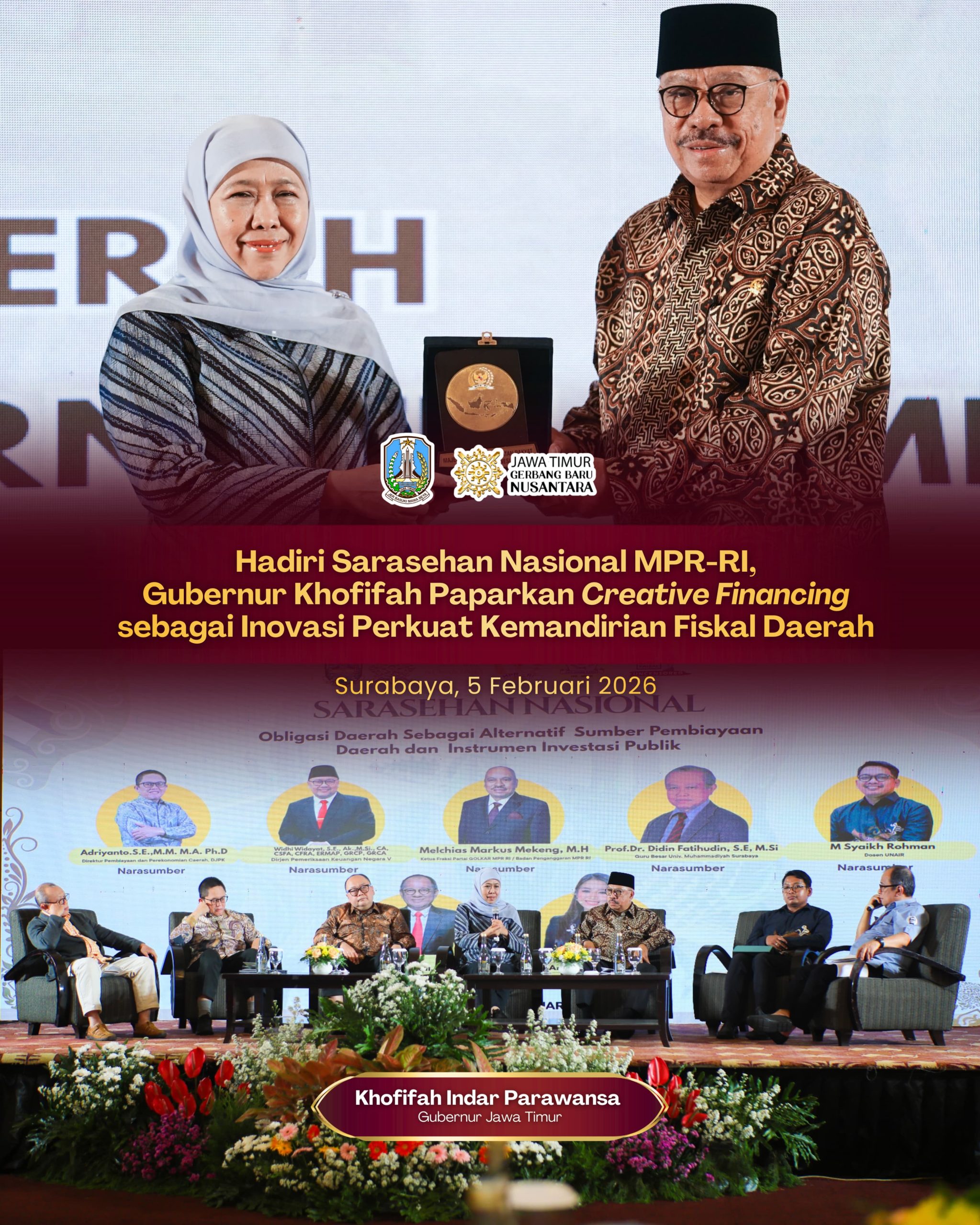 Lentera Post – SURABAYA, 5 FEBRUARI 2026, Gubernur Jawa Timur Khofifah Indar Parawansa memaparkan _creative financing_ sebagai inovasi penguatan kemandirian fiskal daerah di tengah tantangan penyesuaian Transfer ke Daerah (TKD) dan keterbatasan kapasitas APBD.