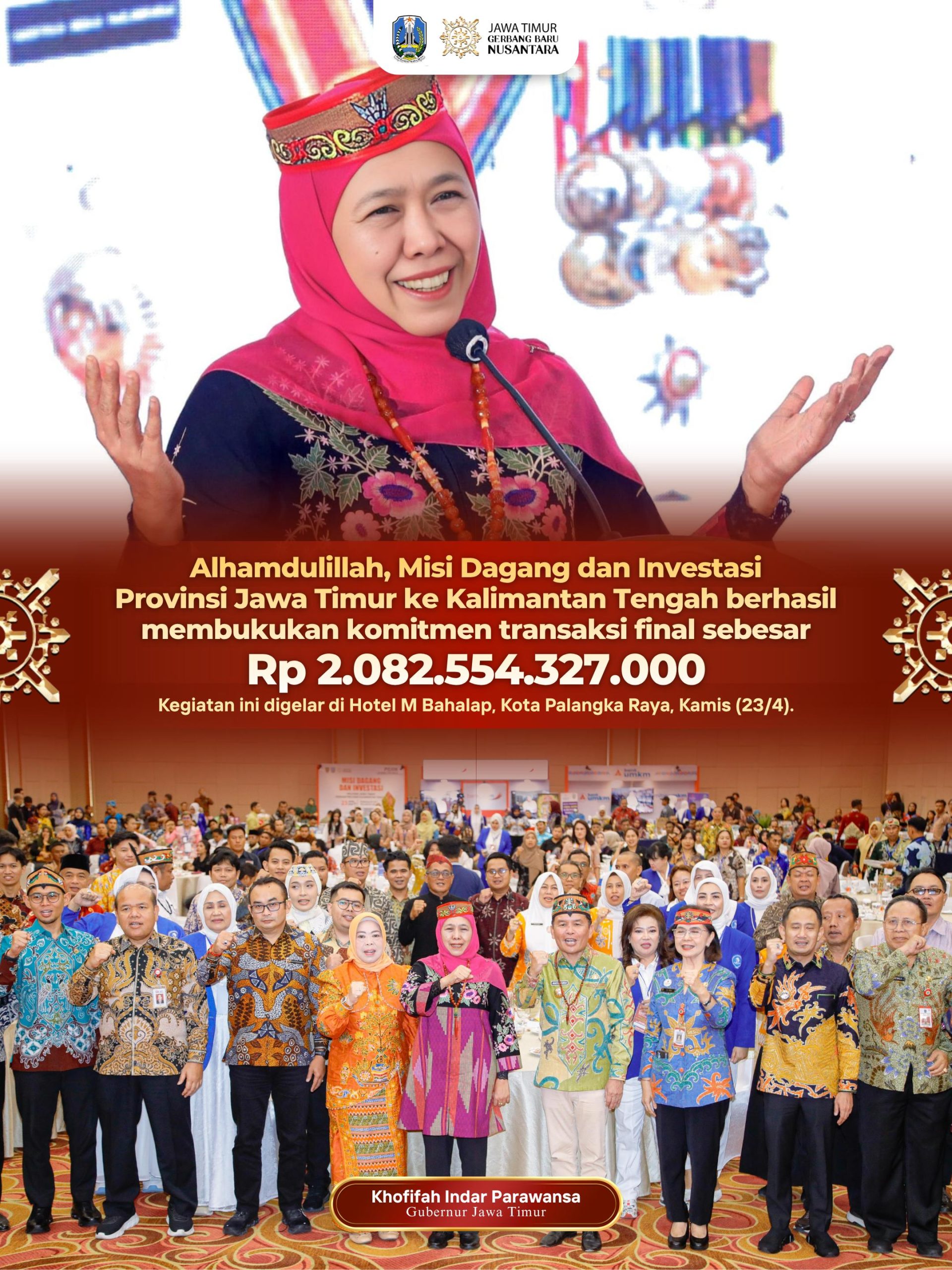 Lentera Post – PALANGKA RAYA, 24 APRIL 2026, Gubernur Jawa Timur Khofifah Indar Parawansa memimpin Misi Dagang dan Investasi Provinsi Jawa Timur ke Kalimantan Tengah yang berhasil membukukan komitmen transaksi final sebesar Rp 2.082.554.327.000 hingga pukul 17.00 WIB. Kegiatan ini digelar di Hotel M Bahalap, Kota Palangka Raya, Kamis (23/4).