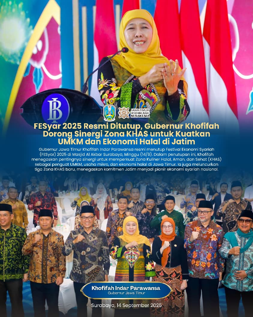 Lentera Post – Surabaya, 16 September 2025, Gubernur Jawa Timur Khofifah Indar Parawansa secara resmi menutup rangkaian Festival Ekonomi Syariah (FESyar) Regional Jawa 2025 di Ballroom Al Marwah, Masjid Nasional Al Akbar Surabaya, Minggu (14/9) sore.
