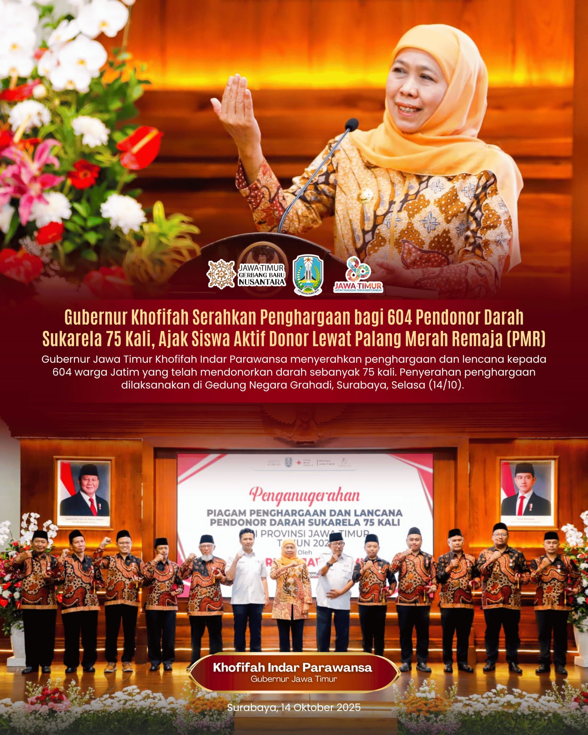Lentera Post – SURABAYA, 14 OKTOBER 2025, Gubernur Jawa Timur Khofifah Indar Parawansa menyerahkan penghargaan dan lencana kepada 604 orang warga Jatim yang telah melakukan donor darah sebanyak 75 kali di Gedung Negara Grahadi, Surabaya, Selasa (14/10).