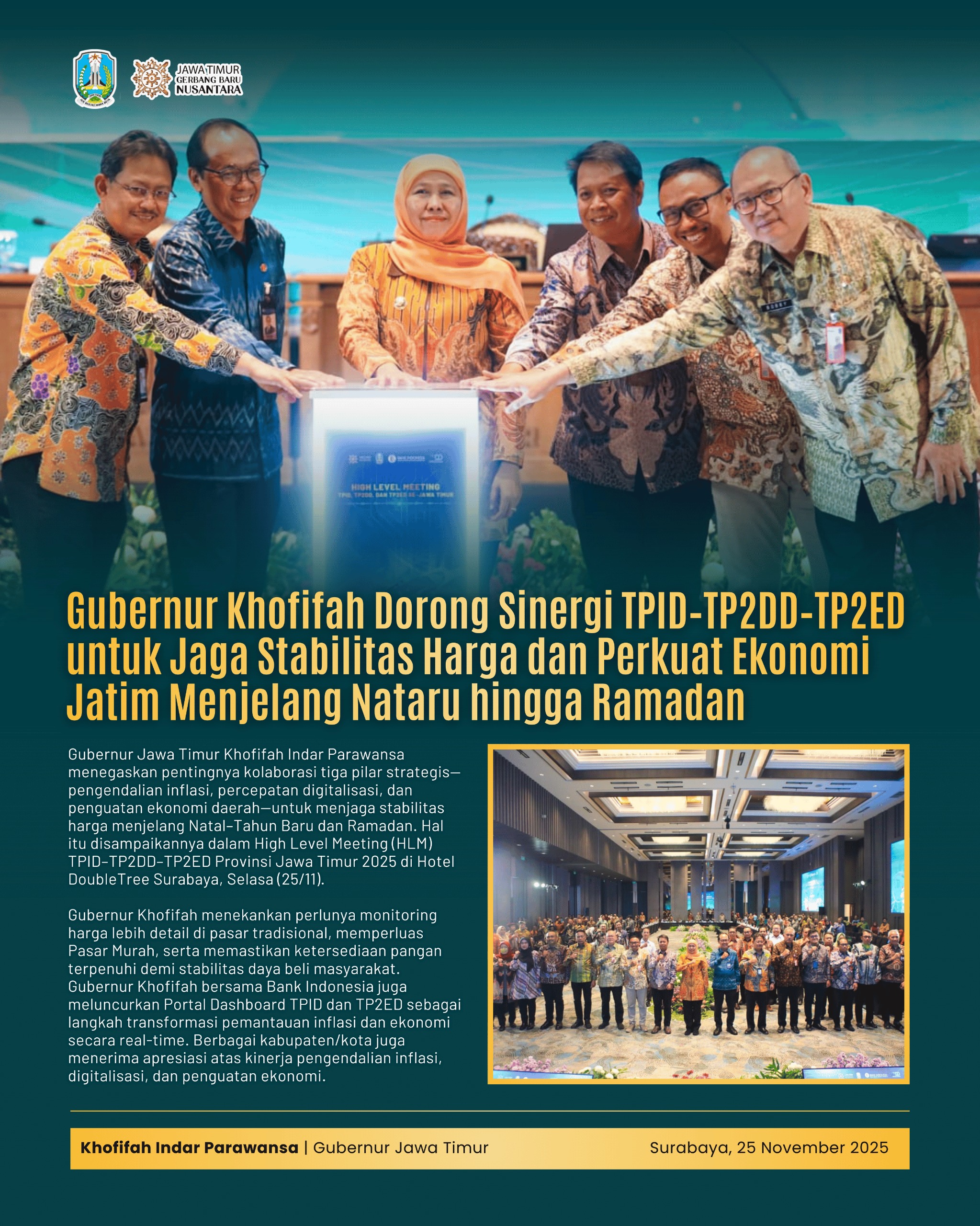 Lentera Post – SURABAYA, 25 NOVEMBER 2025, Gubernur Jawa Timur Khofifah Indar Parawansa mendorong sinergi TPID (Tim Pengendalian Inflasi Daerah), TP2DD (Tim Percepatan dan Perluasan Digitalisasi Daerah) dan TP2ED (Tim Percepatan Pertumbuhan Ekonomi Daerah) untuk Percepatan Pertumbuhan ekonomi dan menjaga stabilisasi harga serta kendalikan inflasi di Jatim khususnya menjelang Natal dan Tahun Baru hingga Bulan Ramadhan dan Idul Fitri 1447 H.