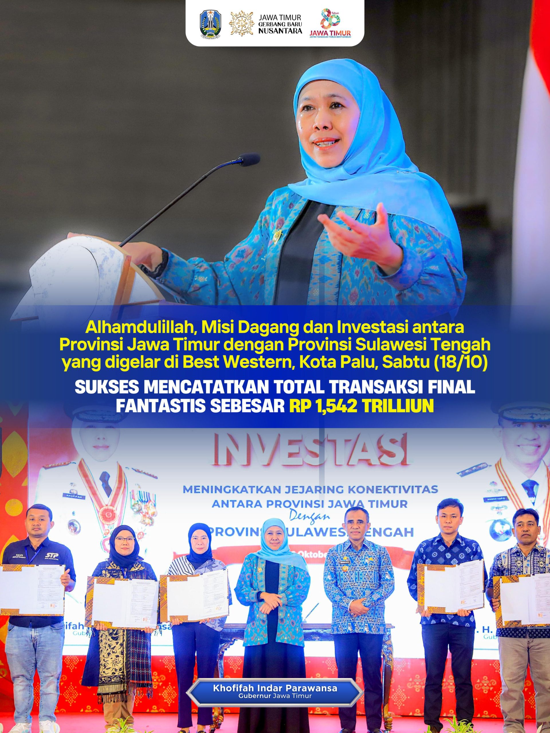 Lentera Post – PALU, 19 OKTOBER 2025, Gubernur Jawa Timur Khofifah Indar Parawansa kembali mencatatkan prestasi membanggakan melalui gelaran Misi Dagang dan Investasi antara Provinsi Jawa Timur dengan Provinsi Sulawesi Tengah yang digelar di Best Western Plus Coco, Kota Palu, Sabtu (18/10).
