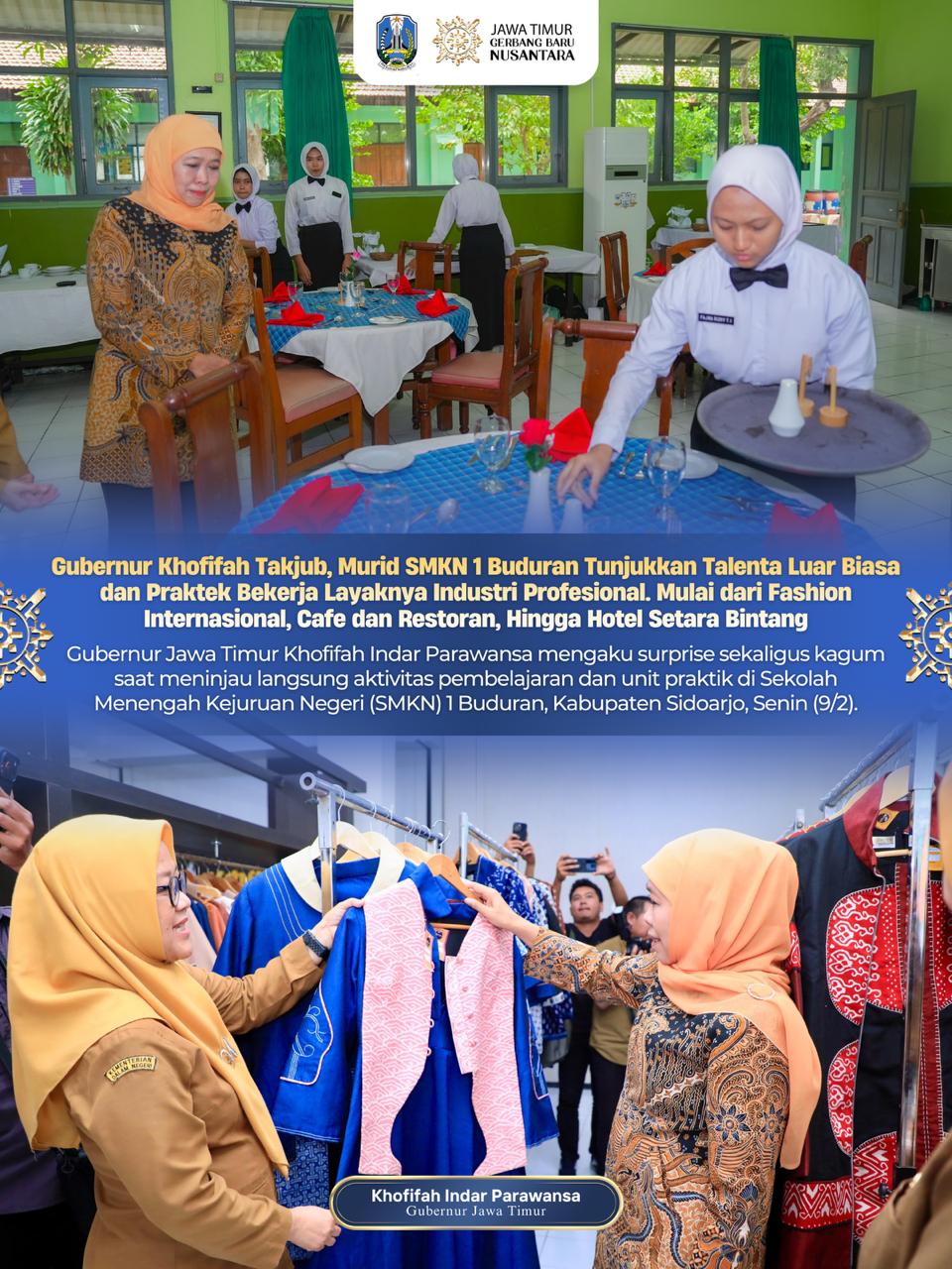 Kabar Nusantara – SIDOARJO, 10 FEBRUARI 2026, Gubernur Jawa Timur Khofifah Indar Parawansa mengaku surprise sekaligus kagum saat meninjau langsung aktivitas pembelajaran dan unit praktik di Sekolah Menengah Kejuruan Negeri (SMKN) 1 Buduran, Kabupaten Sidoarjo, Senin (9/2).