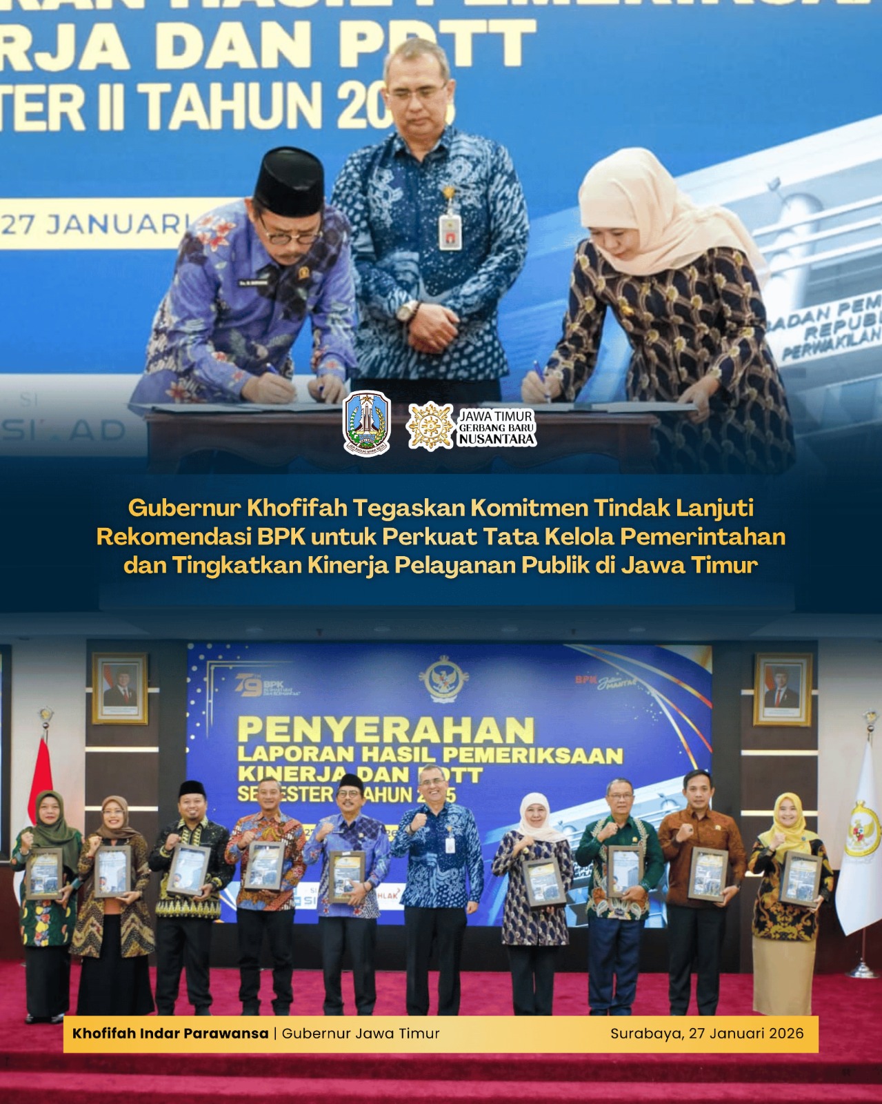 Lentera Post – SIDOARJO, 27 JANUARI 2026, Gubernur Jawa Timur Khofifah Indar Parawansa menerima Laporan Hasil Pemeriksaan (LHP) Badan Pemeriksa Keuangan (BPK) RI kinerja dan PDTT dari Kepala Perwakilan BPK Jatim Yuan Candra Djaisin di Kantor BPK Perwakilan Jatim, Jalan Raya Juanda Sidoarjo, Selasa (27/1).