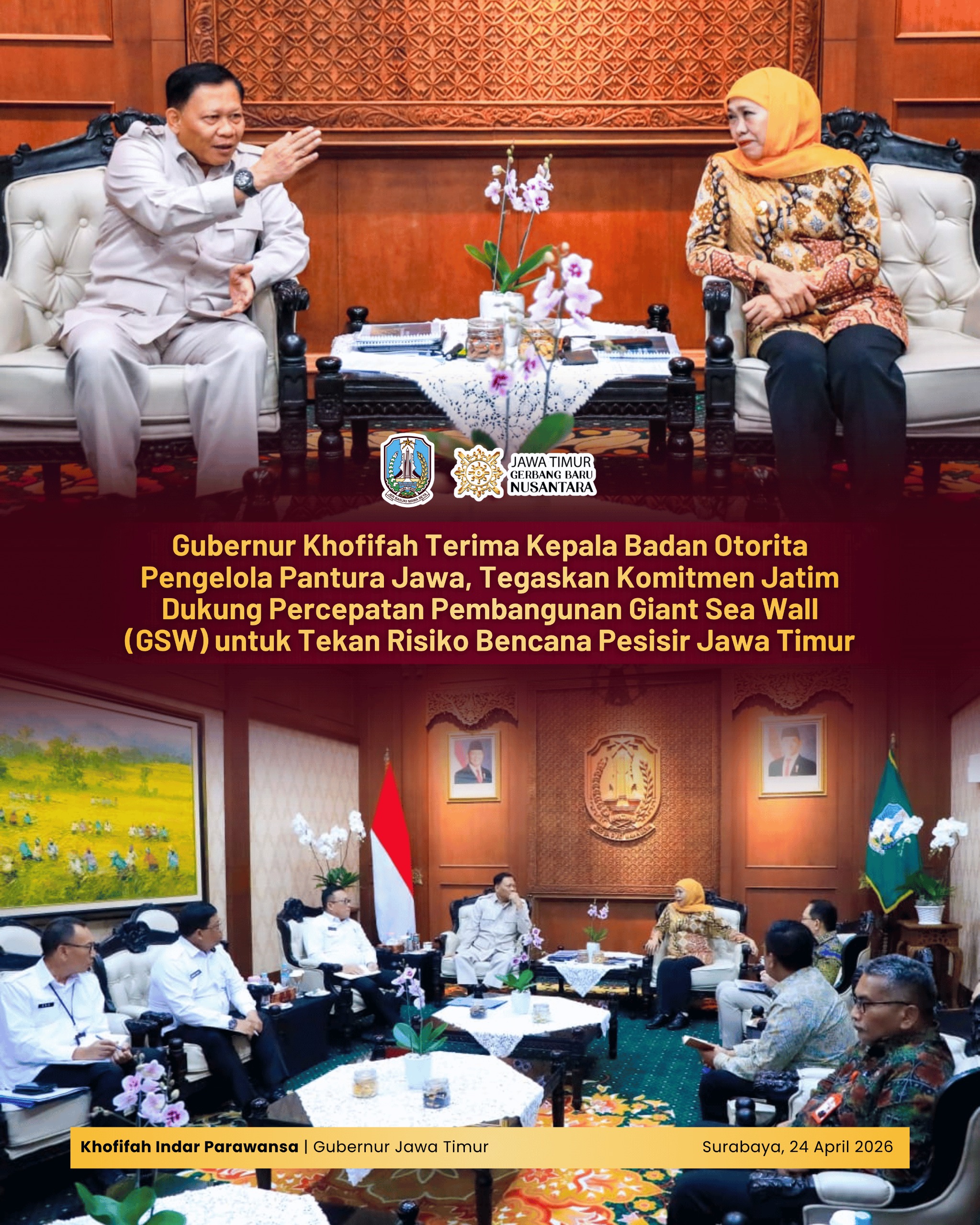 Lentera Post – SURABAYA, 26 APRIL 2026, Gubernur Jawa Timur Khofifah Indar Parawansa menyampaikan Pemerintah Provinsi Jawa Timur siap mendukung percepatan pembangunan Giant Sea Wall (GSW) Jawa Timur yang semula 20 tahun menjadi 15 tahun. Menurutnya hal ini menjadi krusial karena eskalasi risiko pesisir yang semakin cepat.