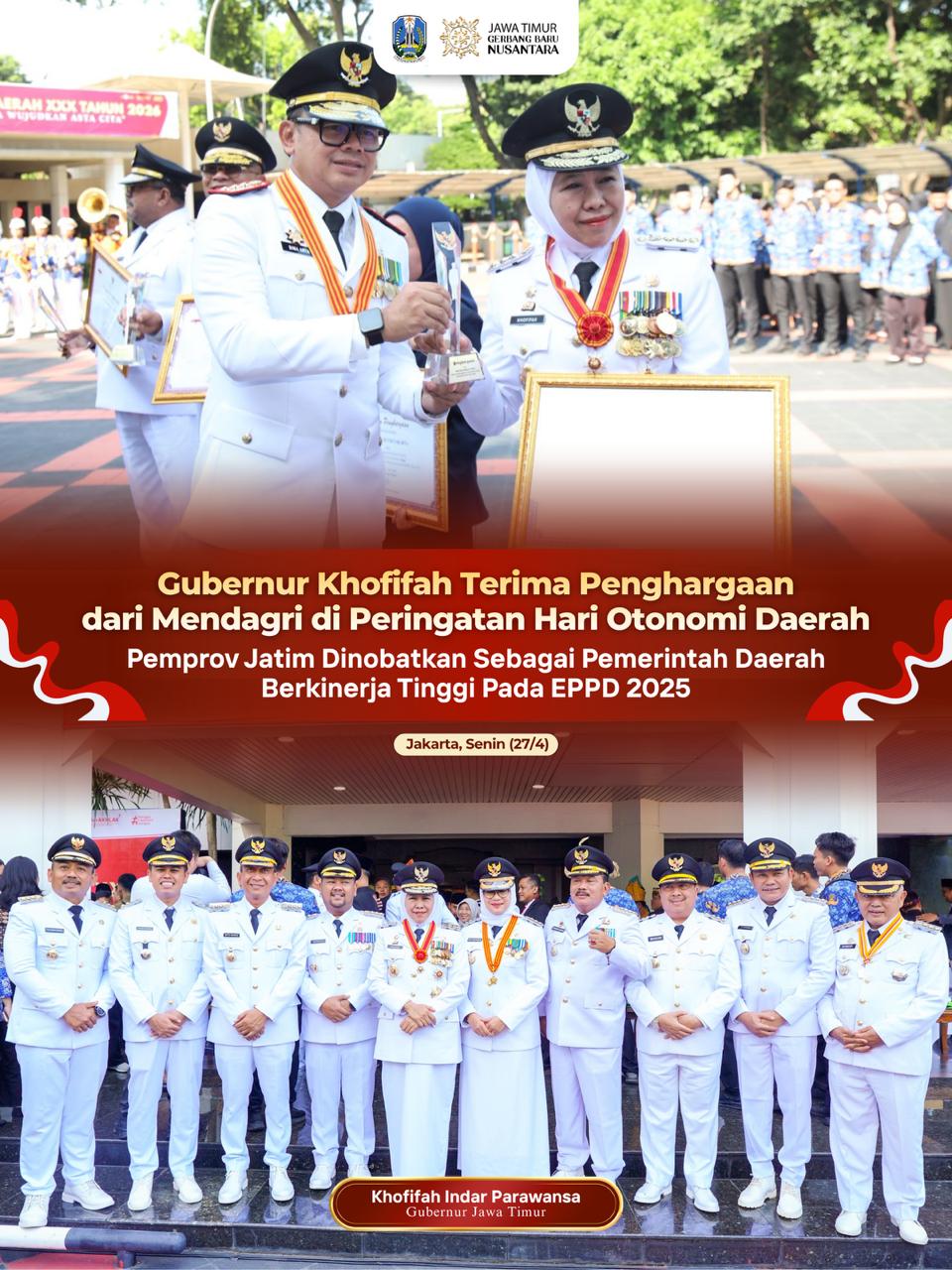 JAKARTA, 27 APRIL 2026, Gubernur Jawa Timur Khofifah Indar Parawansa menerima penghargaan atas Prestasi Penyelenggaraan Pemerintah Daerah dengan skor 3,4695 dan status kinerja tinggi dari Menteri Dalam Negeri (Mendagri) dalam Peringatan Hari Otonomi Daerah XXX Tahun 2026 di Kantor Kementerian Dalam Negeri RI (Kemendagri), Jakarta, Senin (27/4).