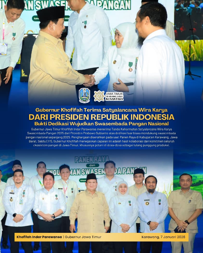 Lentera Post – KARAWANG, 8 JANUARI 2026, Gubernur Jawa Timur Khofifah Indar Parawamsa menerima Tanda Kehormatan Satyalancana Wira Karya Swasembada Pangan 2025 dari Presiden RI Prabowo Subianto.