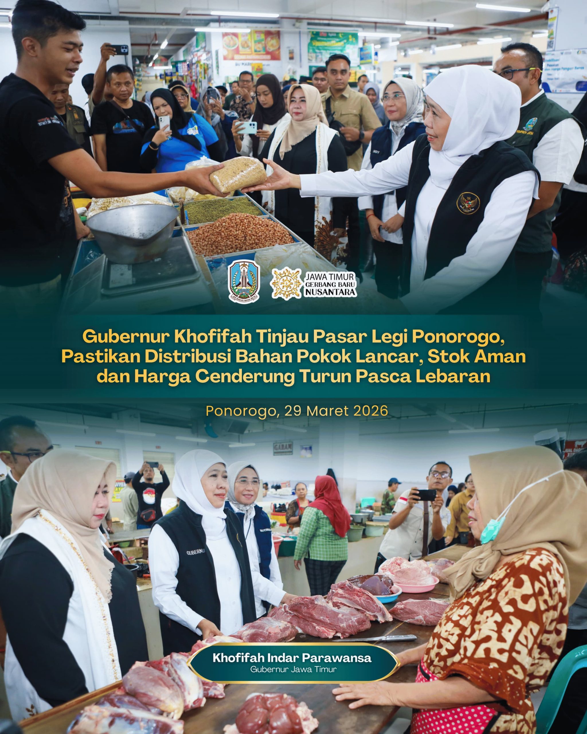 Lentera Post – PONOROGO, 3 April 2026, Gubernur Jawa Timur Khofifah Indar Parawansa meninjau langsung Pasar Legi Ponorogo, Minggu lalu. Hal ini untuk memastikan harga dan ketersediaan kebutuhan pokok tetap stabil pasca Idul Fitri 1447 Hijriah. Hasilnya, harga sejumlah komoditas terpantau terkendali, bahkan sebagian mengalami penurunan.