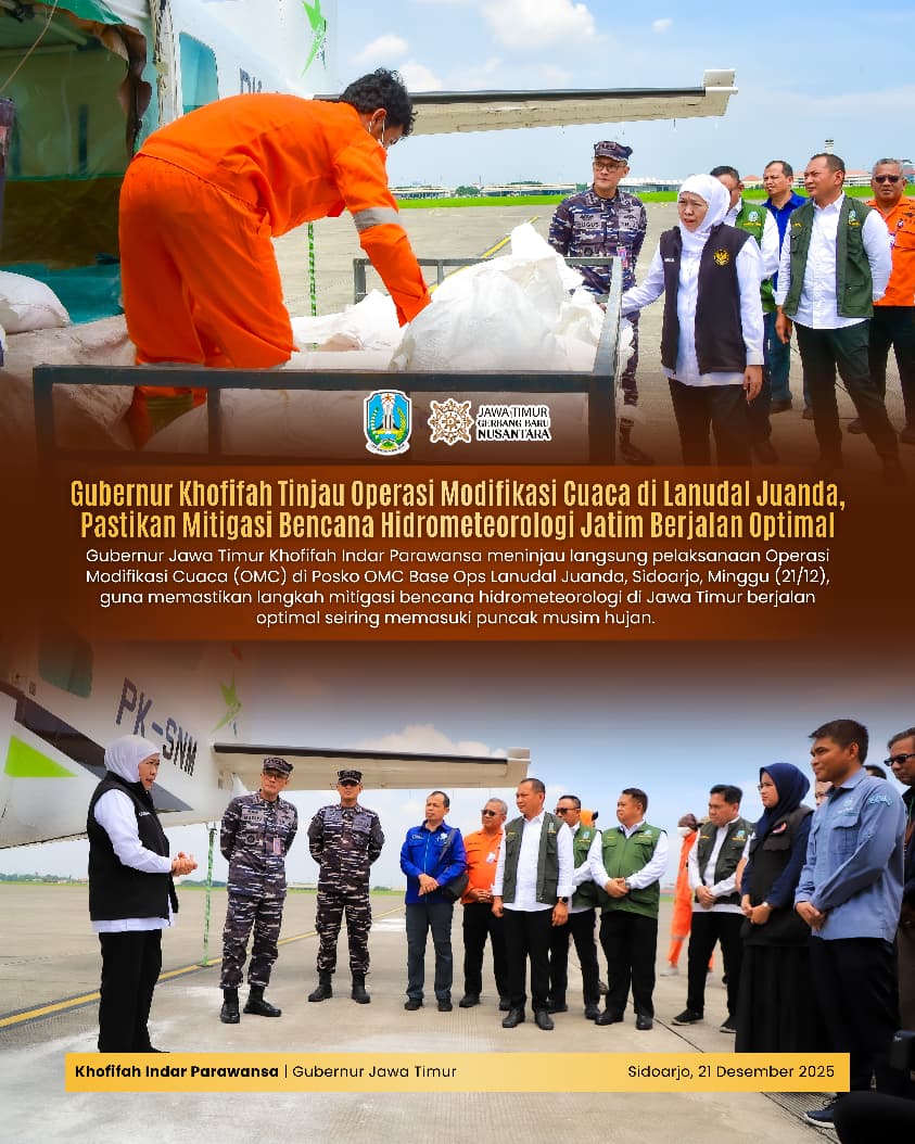Gubernur Khofifah menyampaikan bahwa Operasi Modifikasi Cuaca di Jawa Timur telah dimulai sejak 5 Desember 2025 dan hingga saat ini telah dilakukan sebanyak 30 kali sortie selama 17 hari masa OMC yang telah berjalan. OMC merupakan hasil kolaborasi antara Pemerintah Provinsi Jawa Timur melalui BPBD Jatim, Lanudal Juanda, BMKG, serta PT Milan Pillery Bersatu selaku operator modifikasi cuaca.