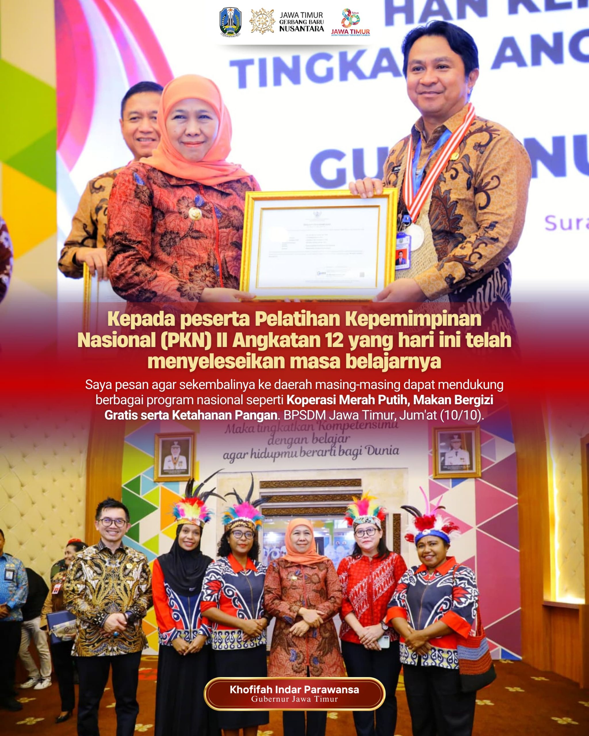 Lentera Post – SURABAYA, 10 OKTOBER 2025, Gubernur Jawa Timur Khofifah Indar Parawansa menutup kegiatan Pelatihan Kepemimpinan Nasional (PKN) Tingkat II Angkatan XII Tahun 2025 di Badan Pengembangan Sumber Daya Manusia (BPSDM) Provinsi Jawa Timur, Jumat (10/10).