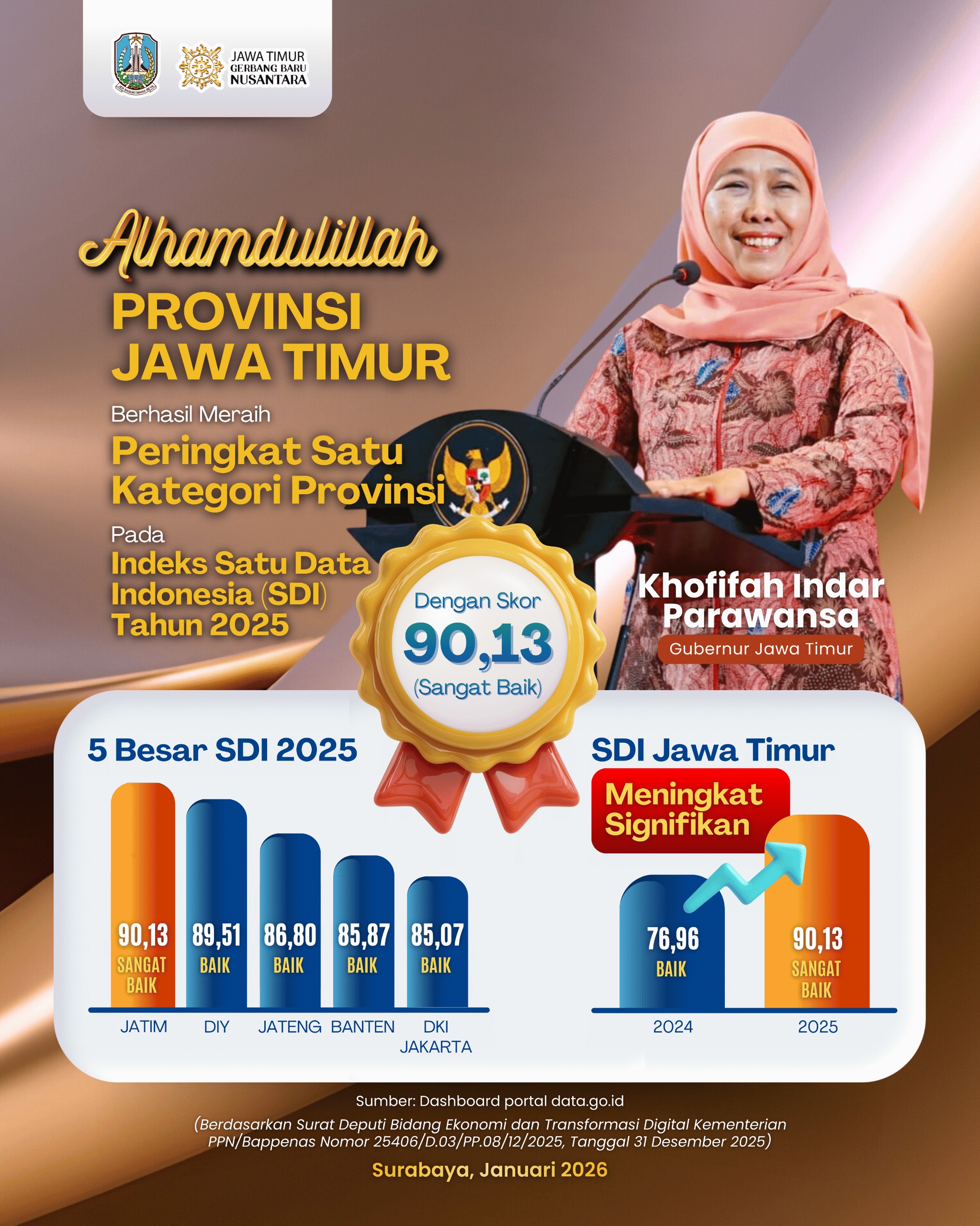 Lentera Post – SURABAYA, 13 Januari 2026, Pemerintah Provinsi Jawa Timur kembali menorehkan prestasi membanggakan di tingkat nasional. Berdasarkan hasil Evaluasi Penyelenggaraan Satu Data Indonesia (SDI) Tahun 2024 yang ditetapkan sebagai Indeks SDI Tahun 2025, Jawa Timur berhasil mencatatkan lonjakan signifikan nilai Indeks SDI, sekaligus meraih peringkat satu nasional dengan skor 90,13. Berdasarkan surat Deputi Bidang Ekonomi dan Transformasi Digital Kementerian PPN/Bappenas nomor 25406/D.03/PP.08/12/2025 tanggal 31 Desember 2025
