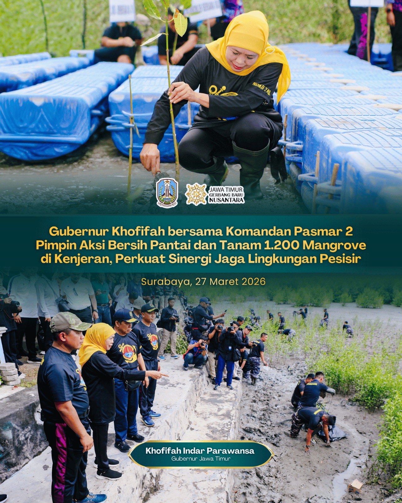 Lentera Post – SURABAYA, 27 MARET 2026, Mengusung semangat menjaga kelestarian kawasan pesisir, Gubernur Jawa Timur Khofifah Indar Parawansa bersama Komandan Pasmar 2 Mayor Jendral Oni Junianto memimpin langsung aksi bersih pantai dan penanaman 1.200 bibit mangrove di Kenjeran Park, Surabaya, Jumat (27/3) pagi.