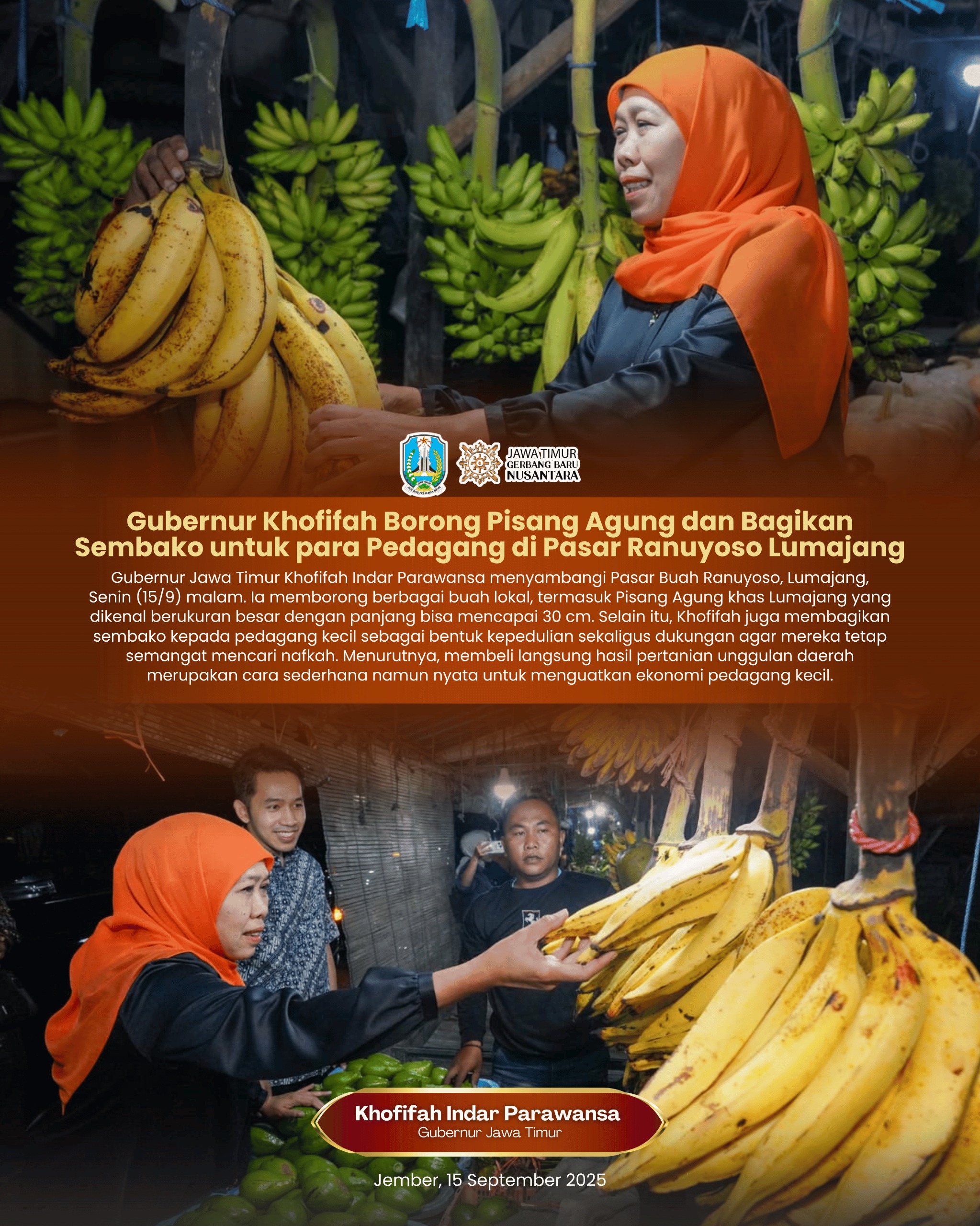 Lentera Post – Lumajang, 16 September 2025 Kehadiran Gubernur Jawa Timur Khofifah Indar Parawansa di Pasar Buah Ranuyoso, Lumajang, Senin (15/9) malam disambut antusias oleh para pedagang kecil. Mereka tampak sumringah saat Gubernur Khofifah menyapa, berinteraksi, hingga berbelanja dagangan mereka.