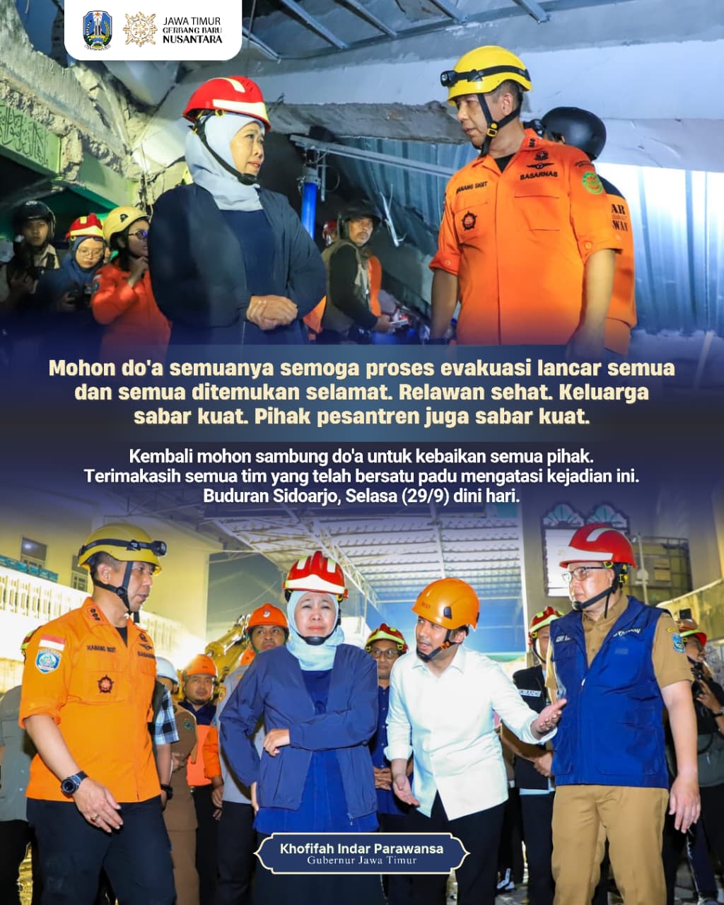 Lentera Post – SIDOARJO, 30 SEPTEMBER 2025, Gubernur Khofifah Indar Parawansa turun langsung memastikan seluruh tim gabungan dari Badan Penanggulangan Bencana Daerah (BPBD) Provinsi Jawa Timur dan BPBD Kabupaten Sidoarjo bersama Basarnas, TNI- POLRI serta relawan terus melakukan evakuasi korban pasca ambruknya Musholla di Pondok Pesantren Al-Khoziny, Buduran, Sidoarjo, Senin (29/9).