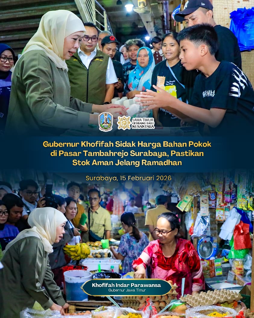 Lentera Post – SURABAYA, 15 FEBRUARI 2026, Menjelang Bulan Suci Ramadhan, Gubernur Jawa Timur Khofifah Indar Parawansa melakukan sidak harga dan ketersediaan bahan pokok di Pasar Tambahrejo, Surabaya, Minggu (15/2) pagi.