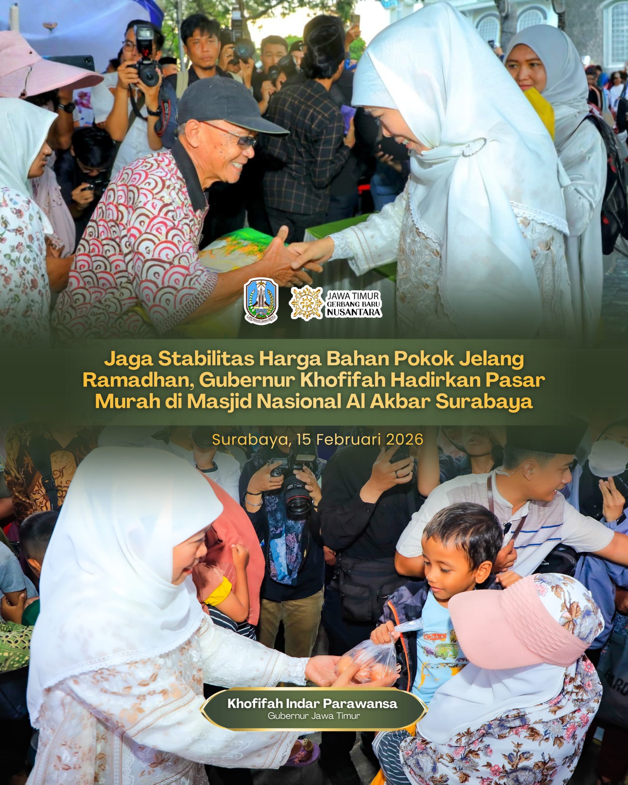 Lentera Post – SURABAYA, 16 FEBRUARI 2026, Ratusan warga memadati kawasan Masjid Nasional Al-Akbar Surabaya untuk mendapatkan kebutuhan pokok dengan harga terjangkau pada kegiatan Pasar Murah yang digelar Gubernur Jawa Timur Khofifah Indar Parawansa, Minggu (15/2).