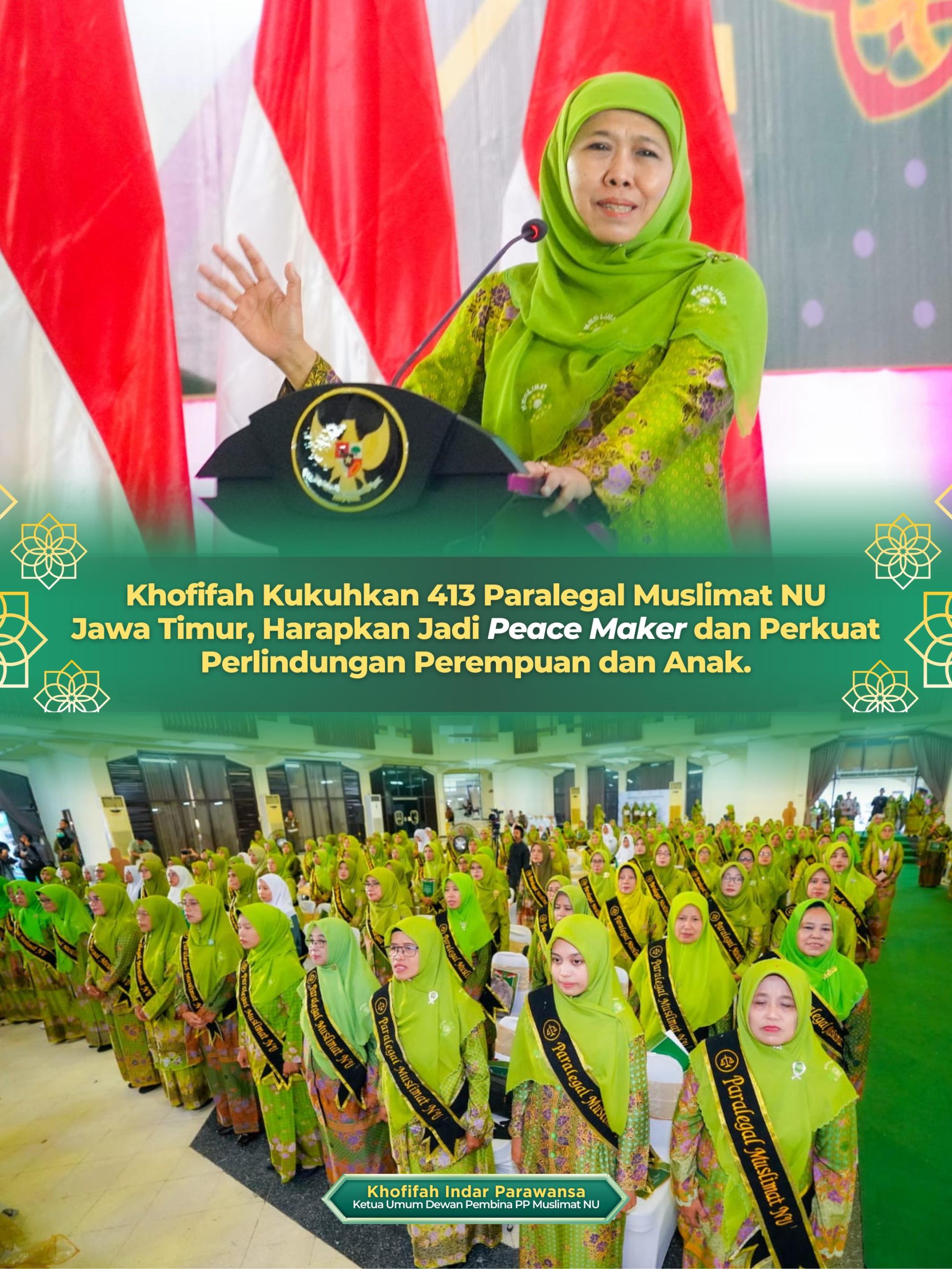 Lentera Post – SURABAYA, 16 FEBRUARI 2026, Ketua Umum Dewan Pembina PP Muslimat Nahdlatul Ulama (NU) yang juga Gubernur Jawa Timur Khofifah Indar Parawansa mengukuhkan 413 Paralegal Muslimat NU se Jawa Timur di Gedung Islamic Centre Surabaya, minggu lalu.