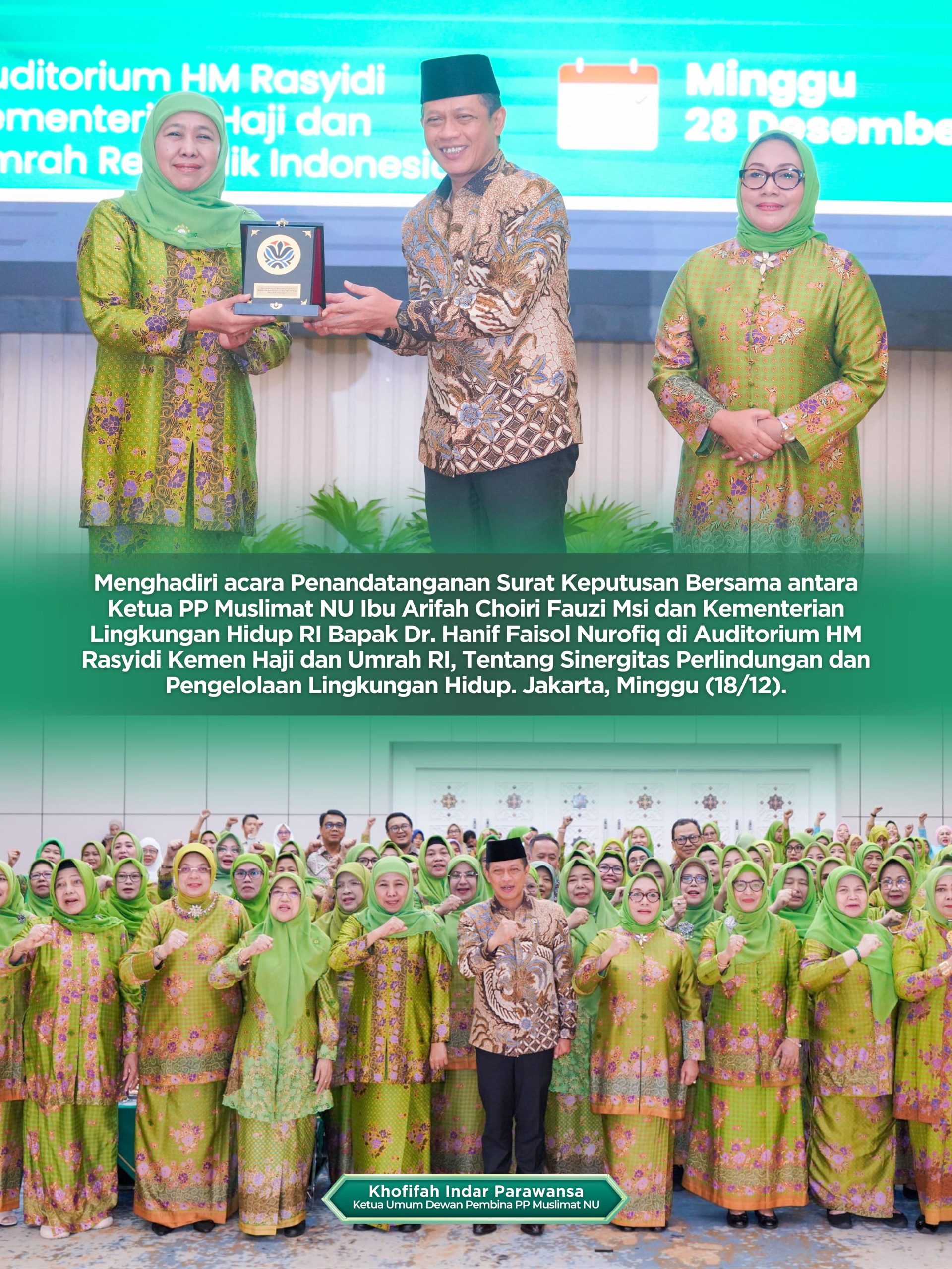 Lentera Post – JAKARTA, 28 DESEMBER 2025, Ketua Umum Dewan Pembina PP Muslimat NU, Khofifah Indar Parawansa menyaksikan penandatanganan Nota Kesepahaman (MoU) tentang Sinergitas Perlindungan Dan Pengelolaan Lingkungan Hidup antara Pimpinan Pusat Muslimat Nahdlatul Ulama (NU) dengan Kementerian Lingkungan Hidup (KLH) Republik Indonesia di Auditorium KH. M. Rasjidi, Kementerian Agama RI, Jakarta, Minggu (28/12).