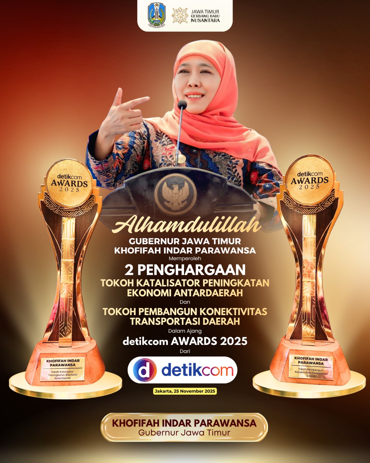 Lentera Post – Jakarta, 26 November 2025, Dua program Gubernur Jawa Timur Khofifah Indar Parawansa yakni Misi Dagang dan Trans Jatim mendapat penghargaan nasional dari Detikcom Award 2025. Dua program ini menjadi pioneer ekonomi kerakyatan.