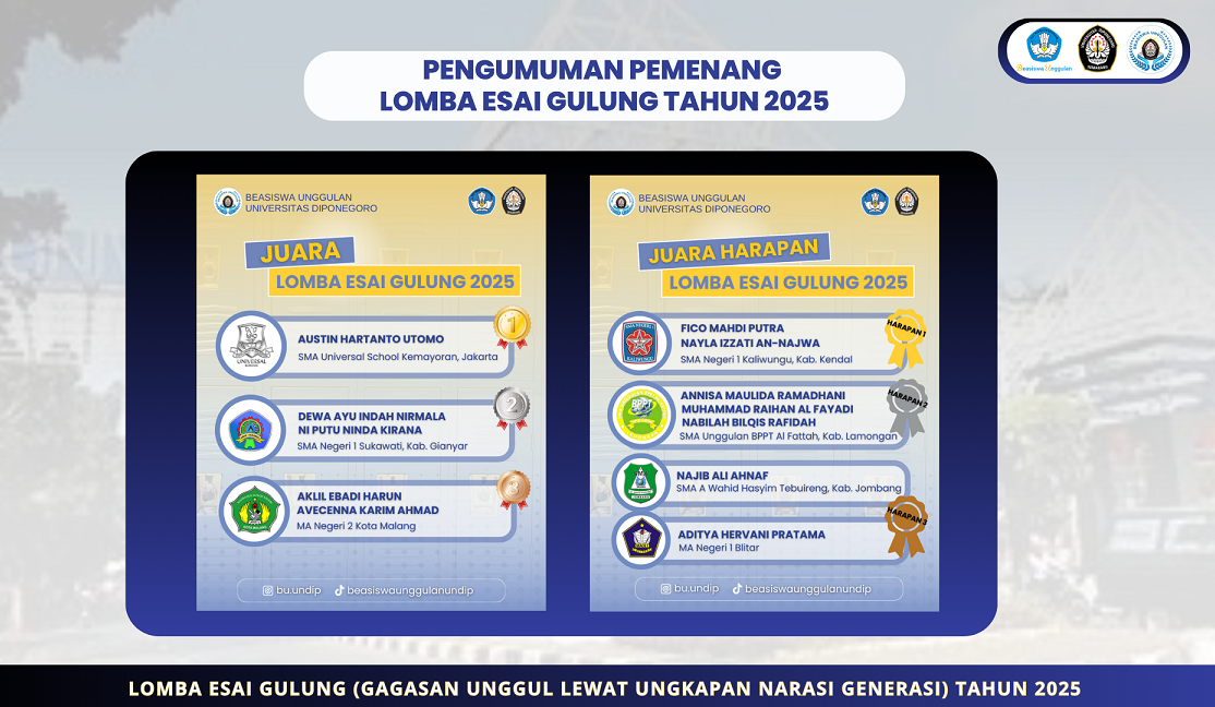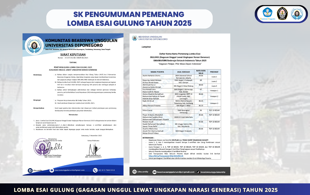 Lentera Post – Semarang (7 November 2025) Komunitas Beasiswa Unggulan Universitas Diponegoro (BU Undip) sukses menyelenggarakan kegiatan tahunan Lomba Esai GULUNG (Gagasan Unggul Lewat Ungkapan Narasi Generasi) Tahun 2025 yang diikuti oleh ratusan pelajar SMA/MA/SMK sederajat dari seluruh Indonesia.