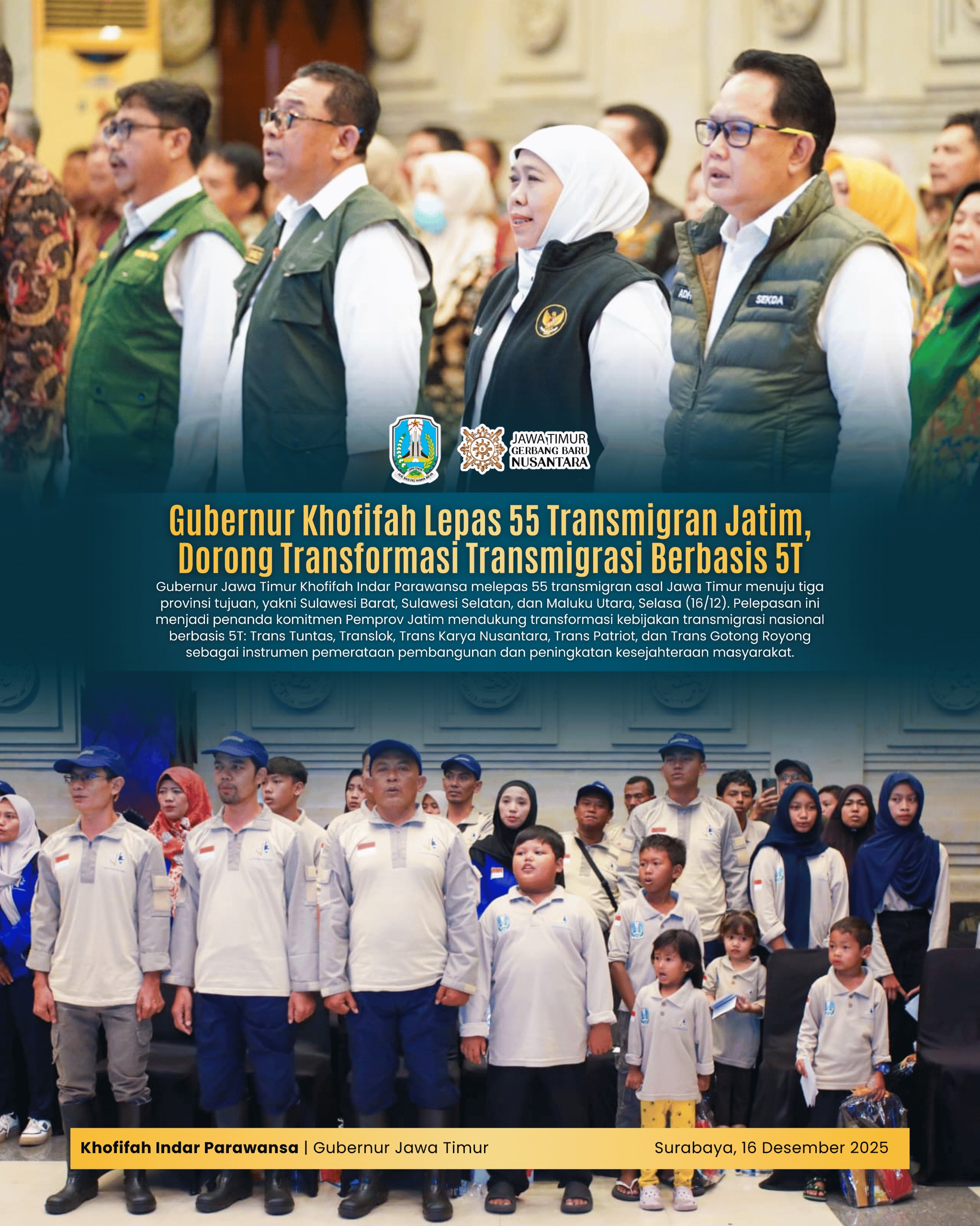 Lentera Post  – SURABAYA, 17 DESEMBER 2025, Gubernur Jawa Timur Khofifah Indar Parawansa melepas keberangkatan 55 transmigran asal Jawa Timur menuju tiga daerah tujuan transmigrasi, yakni Lokasi Penempatan SP Taramanu Tua Kabupaten Polewali Mandar Provinsi Sulawesi Barat, SP Lagading Kabupaten Sidenreng Rappang Provinsi Sulawesi Selatan, serta Waleh SP.3 Kabupaten Halmahera Tengah Provinsi Maluku Utara.