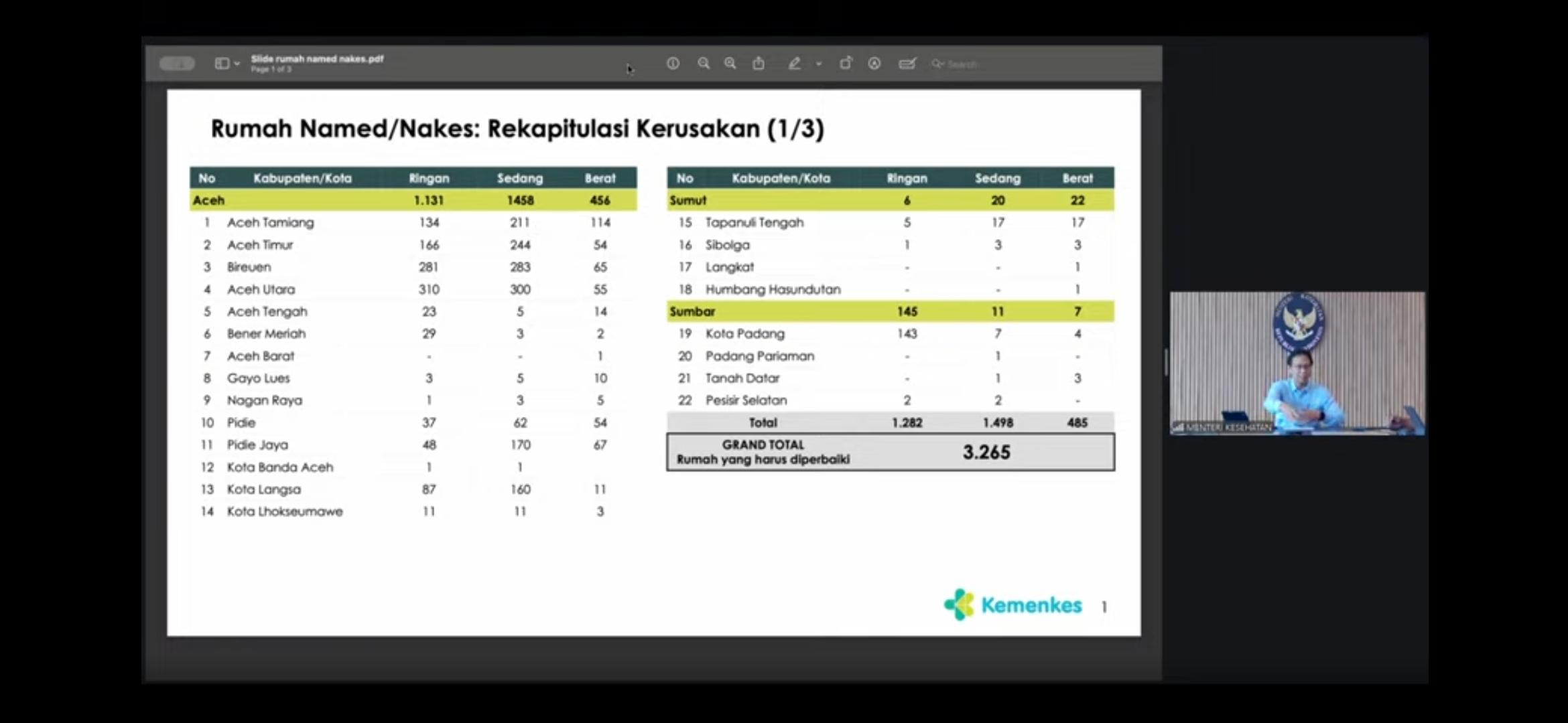 Deputi IV Badan Nasional Penanggulangan Bencana (BNPB) Jarwansyah menyampaikan BNPB telah menerima data dari Kementerian Kesehatan terkait rumah tenaga kesehatan dan tenaga medis yang terdampak bencana di tiga provinsi di Sumatra. “Data rumah Named dan Nakes terdampak dengan rincian di Aceh sebanyak 3.050 unit, di Sumatra Utara 48 unit, dan di Sumatra Barat 167 unit, dengan total 3.265 unit rumah,” kata Jarwansyah.