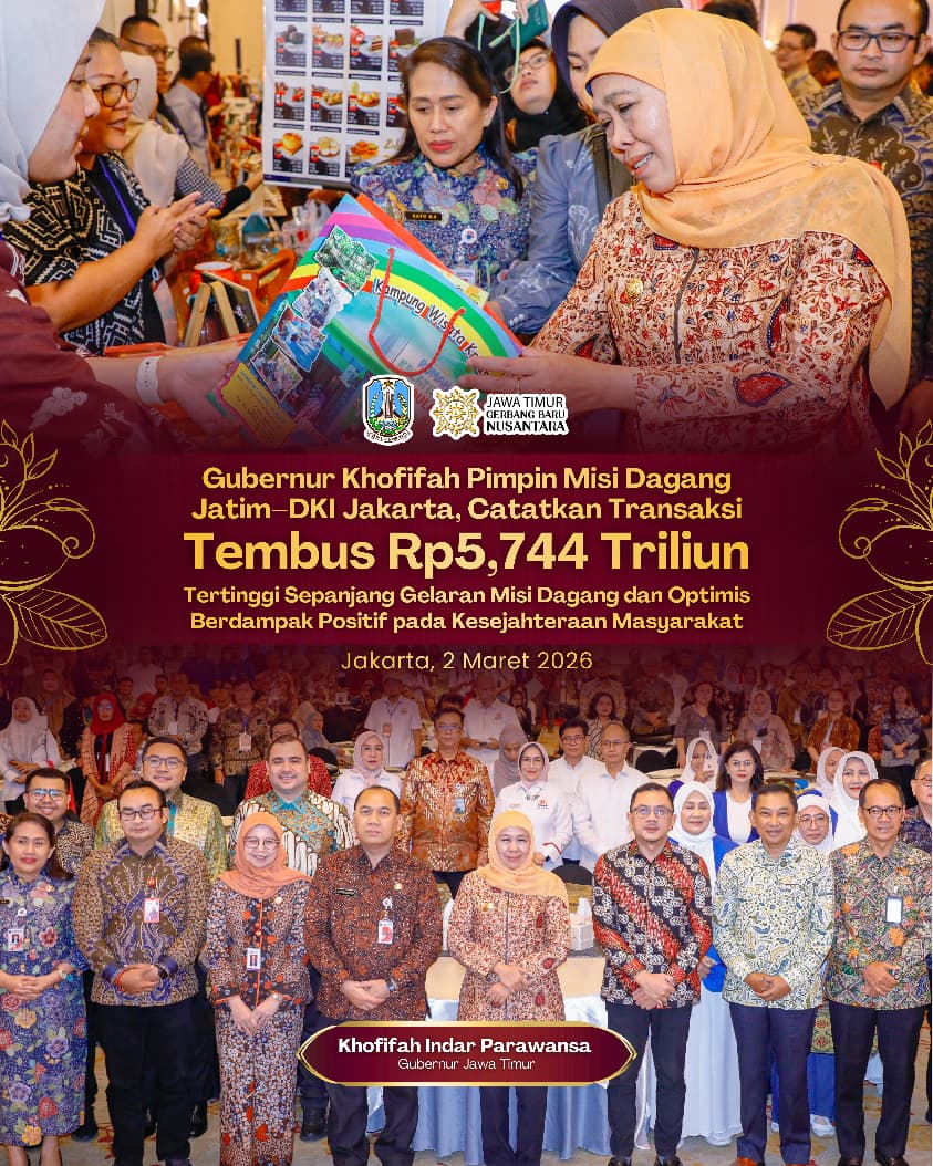 Sebagai gambaran, pada periode 2019-2026, Jatim telah menggelar 49 kali Misi Dagang dalam negeri dengan total komitmen transaksi Rp 30,50 Triliun dari 2.153 transaksi, serta melibatkan 2.410 pelaku usaha.