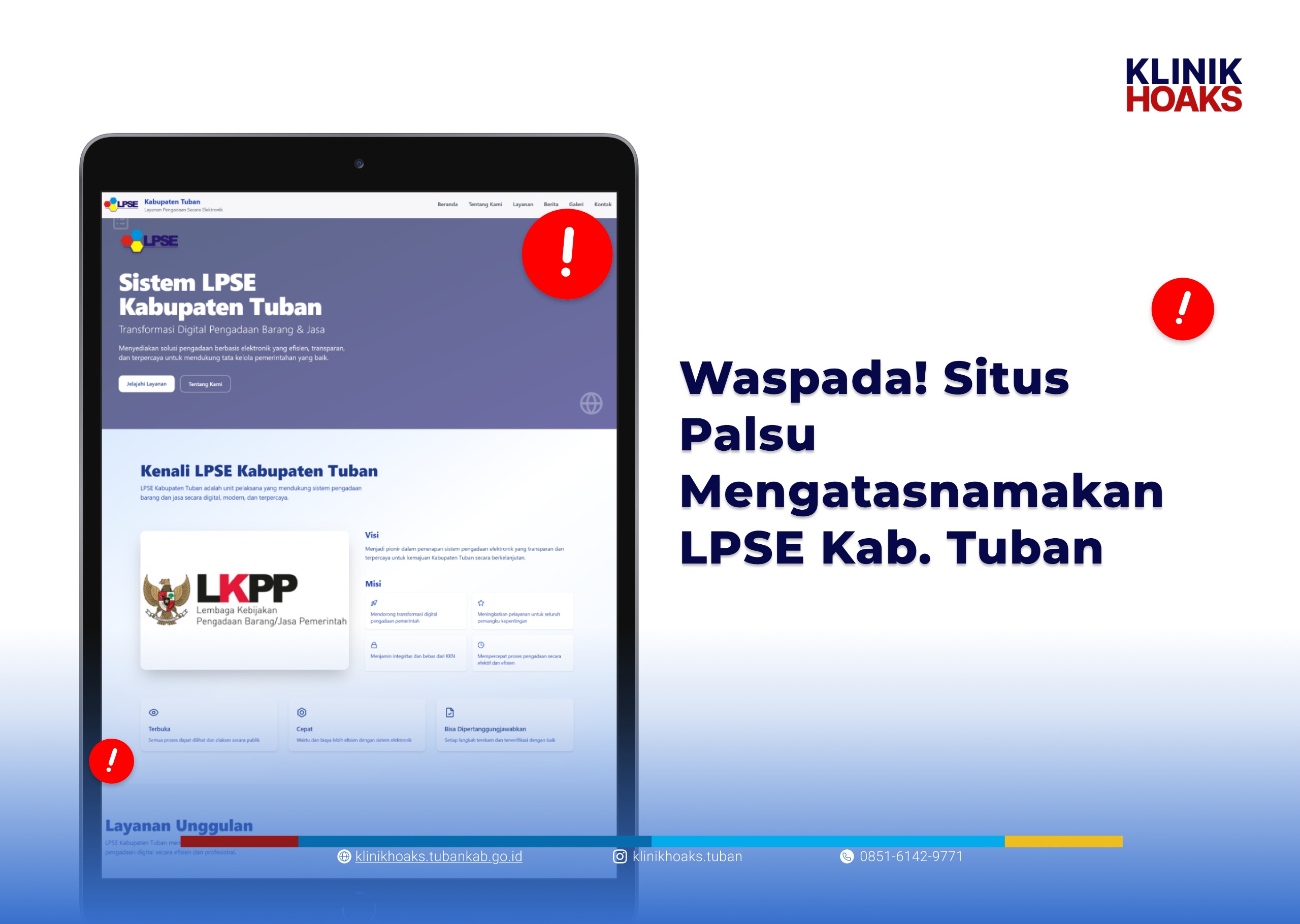 Tuban, LenteraPost – Masyarakat diimbau berhati-hati terhadap beredarnya sebuah website palsu yang mengatasnamakan Layanan Pengadaan Secara Elektronik (LPSE) Kabupaten Tuban dengan alamat domain https://www.lpsekabtuban.com.