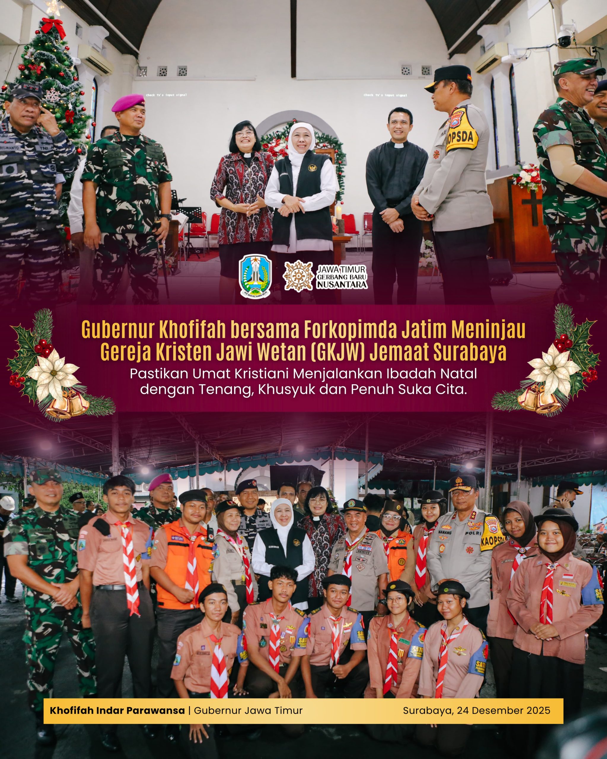 “Kami ingin memastikan umat Kristen dan Katholik dapat menjalankan ibadah Natal dengan aman, lancar, damai, dan penuh suka cita. Pemerintah daerah bersama TNI dan Polri hadir untuk menjamin keamanan dan kenyamanan seluruh jemaat,” tegas Khofifah.