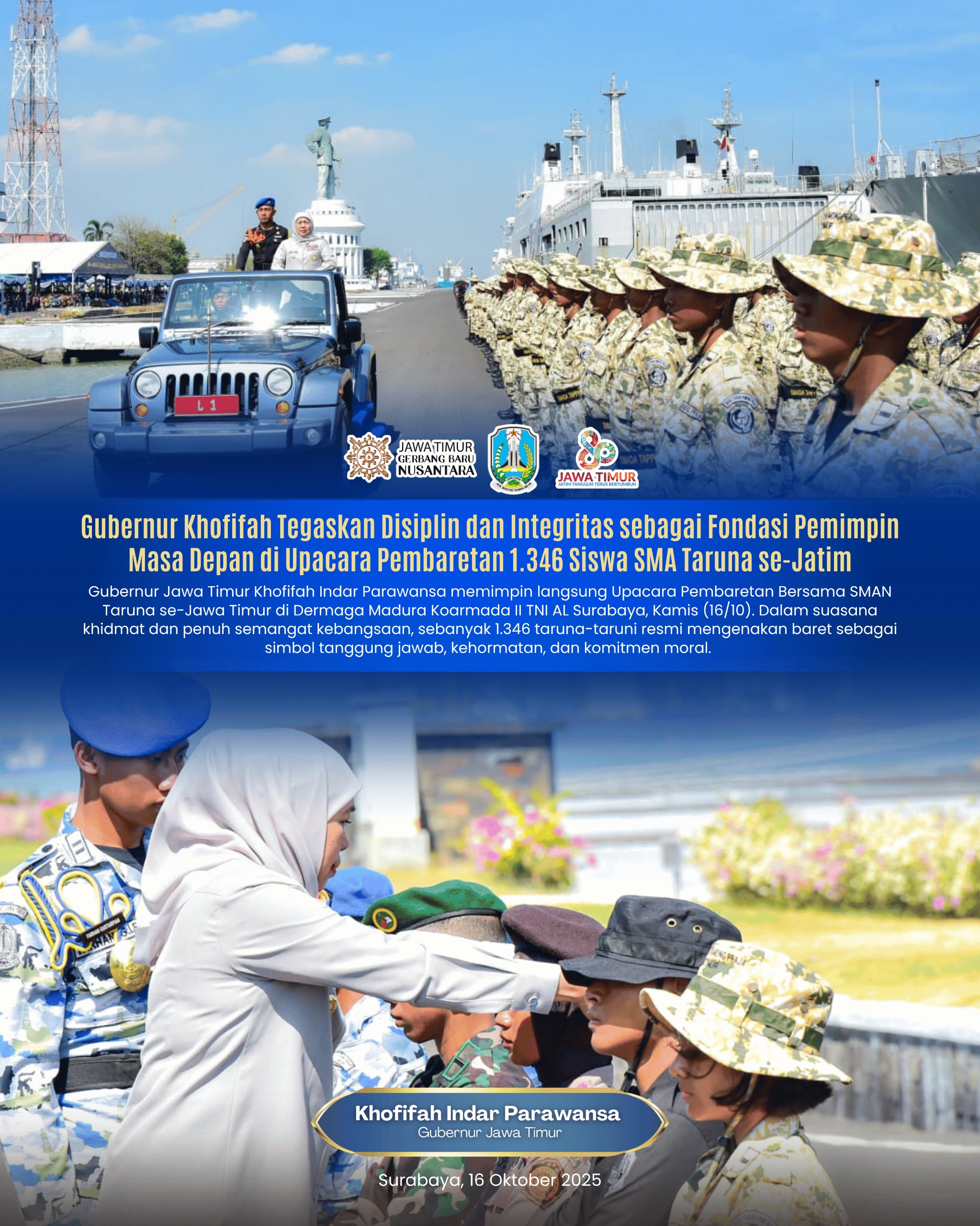 Hal tersebut disampaikan saat memimpin Upacara Pembaretan secara kolektif 1.346 Siswa SMAN Taruna se-Jawa Timur Tahun 2025 yang digelar di Dermaga Madura, Koarmada II TNI Angkatan Laut Surabaya, Kamis (16/10).